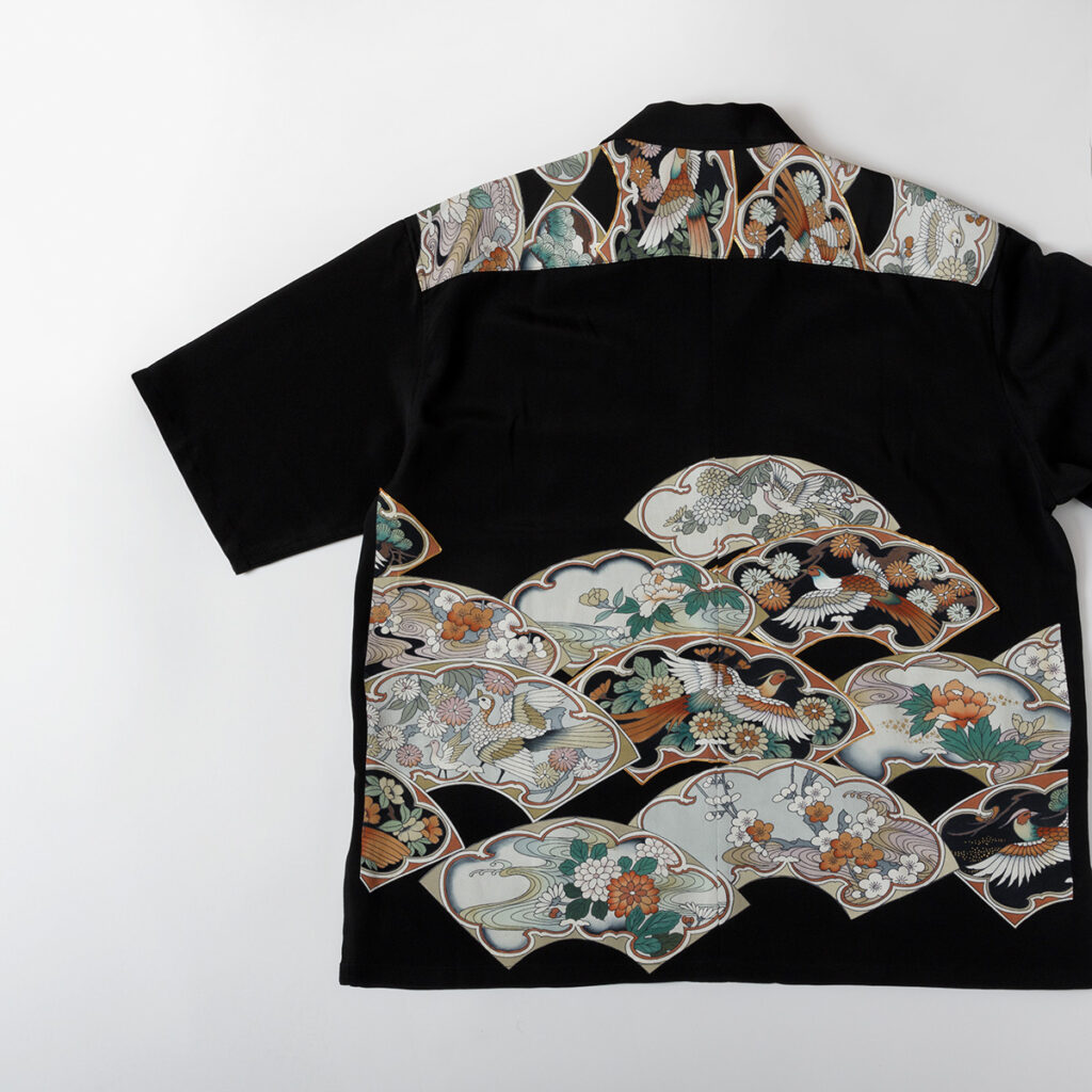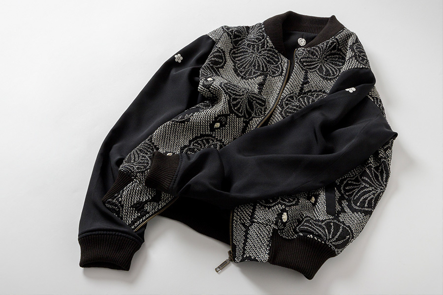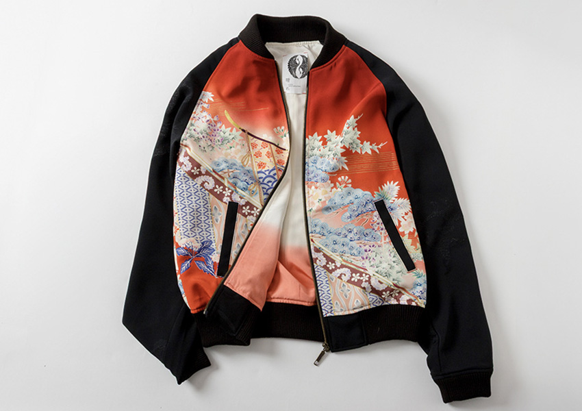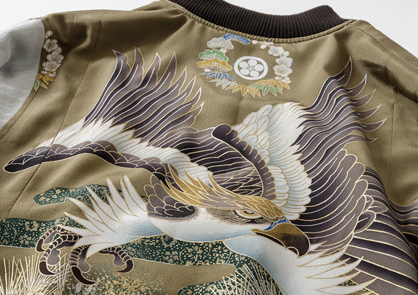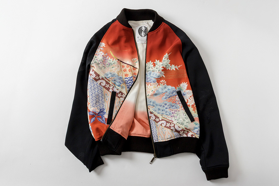 その後、形はアメリカ人に親しみやすいベースボールジャケットを模し、刺繍は桐生や足利の職人に依頼。アメリカ軍兵士たちのあいだでは、「スーベニアジャケット」として親しまれ、1960年代ごろから「スカジャン」と呼ばれるようになったという。現在もクールな和風ジャケットとして海外のファッショニスタたちか愛され続けている。そのスカジャンに着物の意匠を大胆かつ晴れやかに取り入れたのが、同店の「HAREJAN」だ。