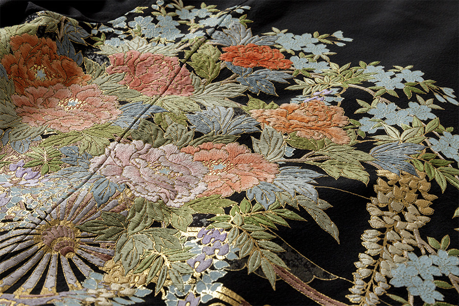 また、成人式という人生の晴れ舞台で纏う「振袖」も、「HAREJAN」に欠かせない着物である。豊富な色や吉祥文様が描かれ、初々しくも華やかな振袖と八掛を配置した晴れやかな一枚は、ユニセックスな魅力を放つ。加えて、着物の中で最も気高く“家”の格調を表すとされる「黒留袖」も、大切なマテリアル。絢爛豪華なものから繊細優美なものまで、お眼鏡に叶う一枚が見つかるはずだ。