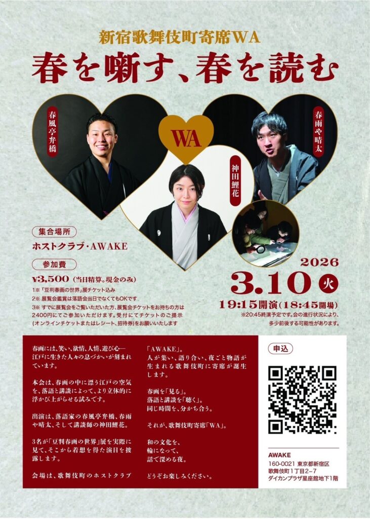 本展覧会は3月15日で終了するが、4月4日からは「『北斎・英泉 艶くらべー歌舞伎町花盛りー』新宿歌舞伎町春画展WA 」が開催される。興味を持った方はぜひ、そちらにも足を運んでみてほしい。