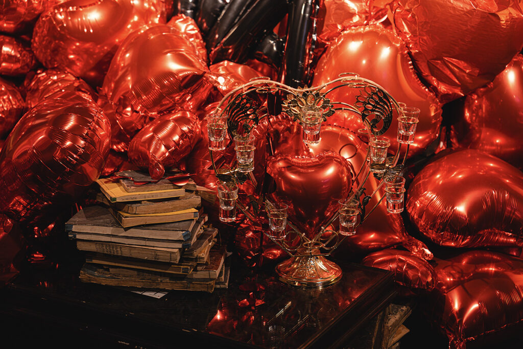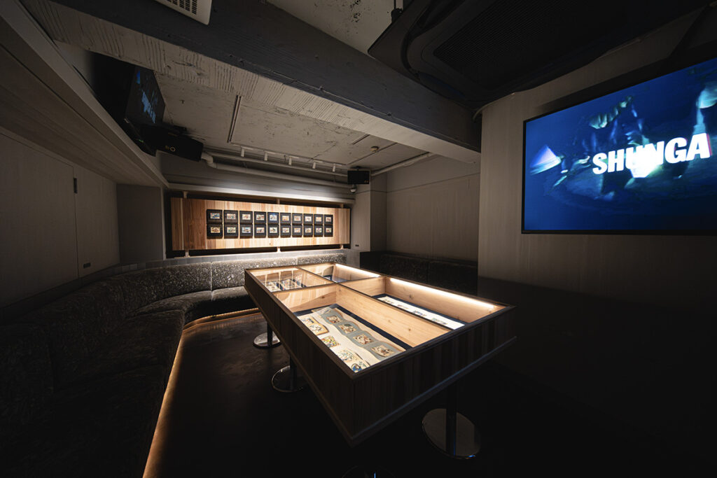 もう一つの会場、ホストクラブ「BOND」へは徒歩3分ほど。今回の展覧会用に改装された店内は、アート鑑賞にはムーディすぎると感じるかもしれない。しかし、誰かと密やかに楽しむ春画の性格上、これ以上ないほど適した空間のようにも感じられてくる。