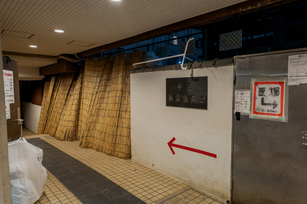 本展は二つの会場に分かれている。まずは受付のある第一会場「新宿歌舞伎町能舞台」へ向かった。私は以前、歌舞伎町アートナイト「BENTEN」で一度訪れたことがあるのだが、初めて訪れる人にとっては入り口がわかりにくいかもしれない。マンションの1階にあるゴミ捨て場を通り抜け(!)、階段を上がった2階にある。