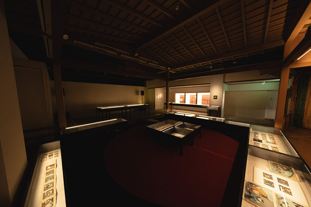 会場内は、繊細な作品の劣化を防ぐために照明がぐっと落とされ、能を鑑賞する時のように舞台が薄暗い中に浮かび上がっている。展示ケースは舞台の周りだけでなく、舞台上にも座って鑑賞できるスペースが設けられている。正座やあぐらで春画を見ていると、江戸時代もこんな感じで見せ合いっこしていたのだろうか、と想像が膨らむ。
