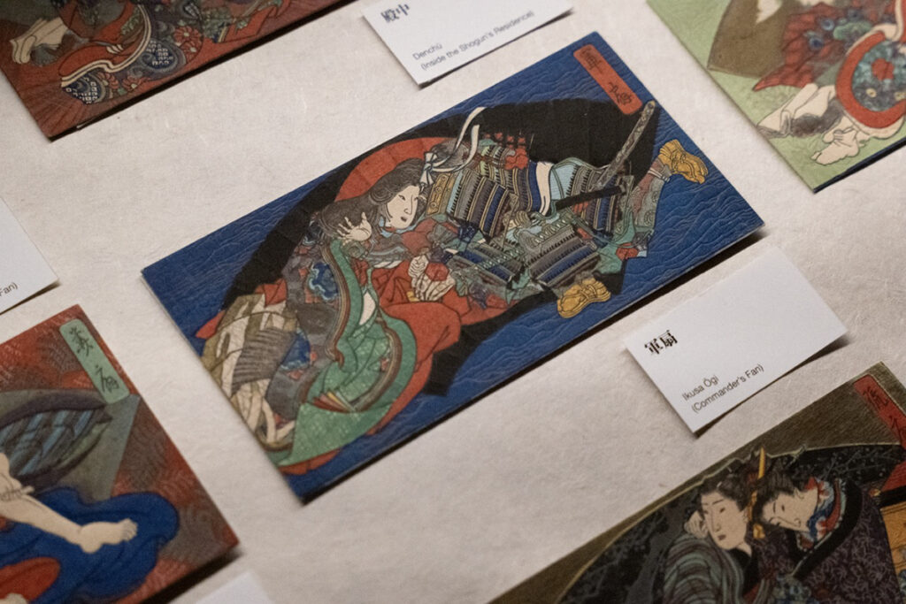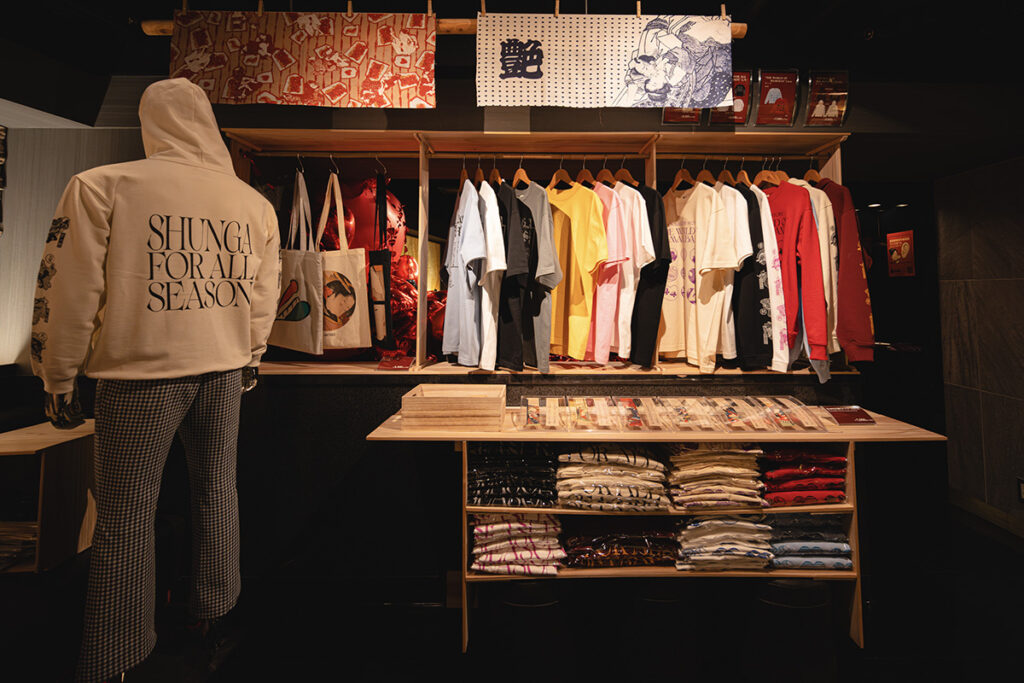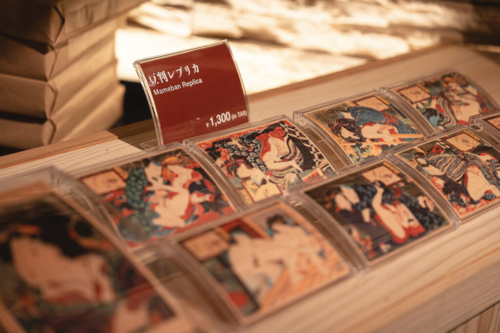 春画を堪能した後は、第二会場のBONDに設けられたオリジナルグッズの物販コーナーでお土産を選ぼう。春画と分からないよう工夫されたデザインで、日常的に身につけやすい。豆判春画のサイズ感を実感できるカードセットやレプリカもあるため、当時の人々のように誰かと見せ合ったり、交換するのも一興だろう。