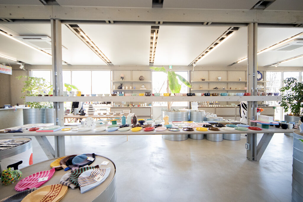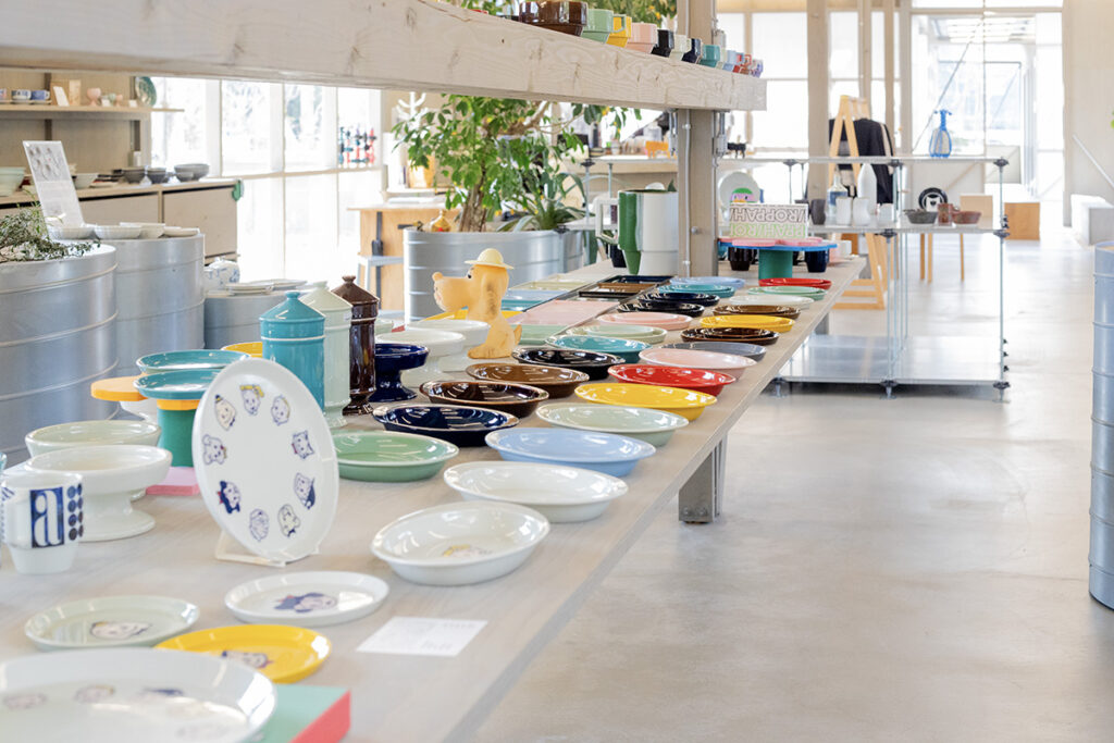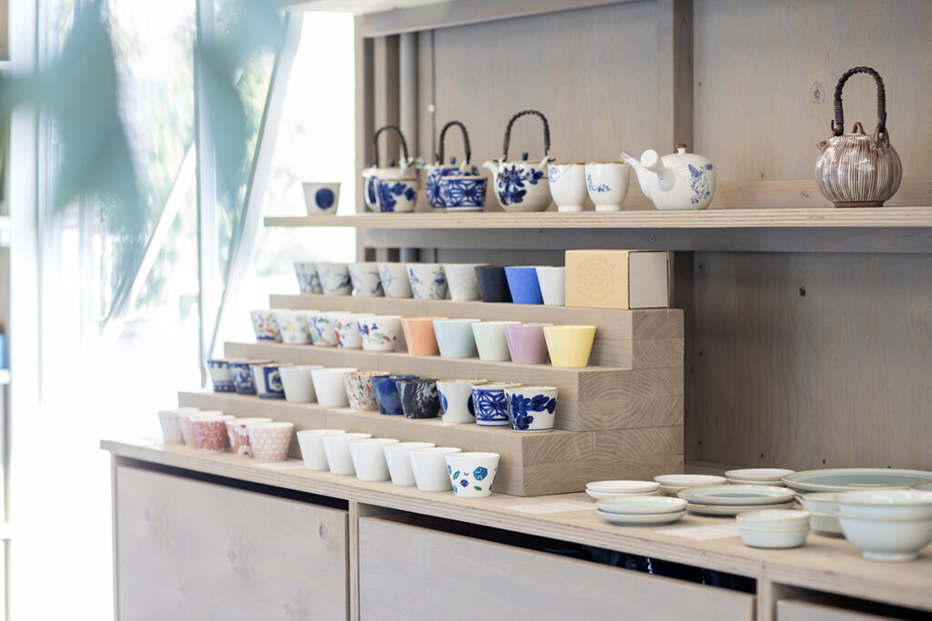店内も、積み上げられた安売りの店とは一線を画し、一枚ずつの器の表情を大切に見せる空間にした。「入る前から怒られそうな、触るなよと言われるようなお店にはしたくない」という想いが、バリアフリーで開放的な空間を実現させた。