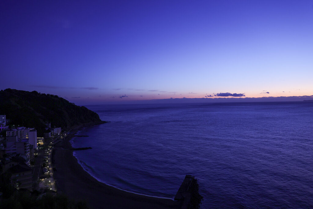 時間帯によって表情豊かに染まる海と空。満月の頃は“日本百名月”に選出されるムーンロードも見られる。