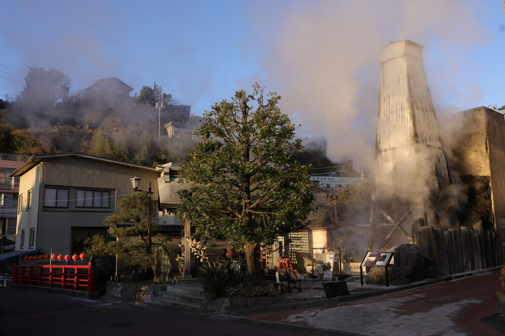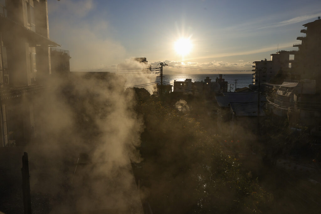 自噴する豊富な湯量は伊豆随一。街をそぞろ歩くと、今なお木造の温泉櫓が随所に残る。朝日に照らし出される湯煙も、どこか幻想的。