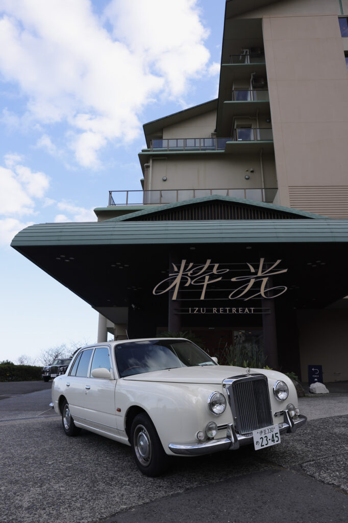 海に面したテラスには空を映し出す水盤を配し、眼下の相模湾と溶け合う光景に圧倒される。駅からの送迎は、1990年代のクラシックカー「ガリューⅠ」。細やかな演出にも気持ちが高揚する。