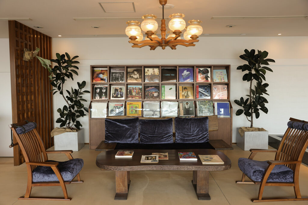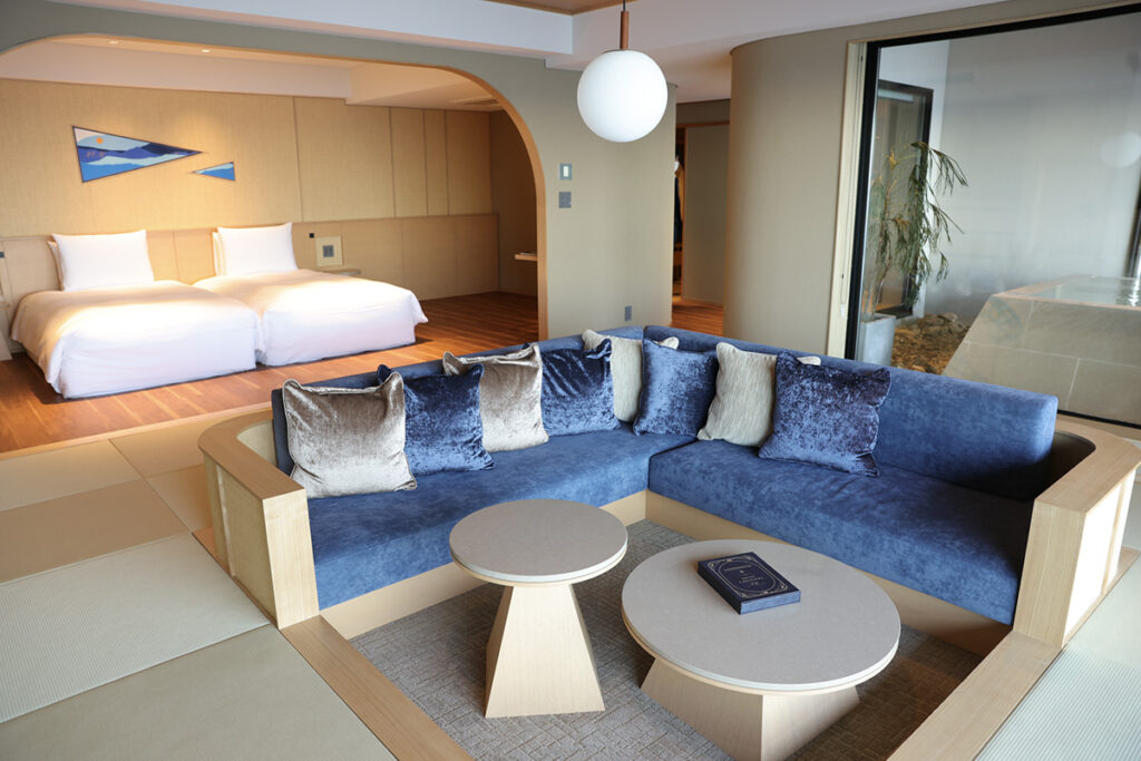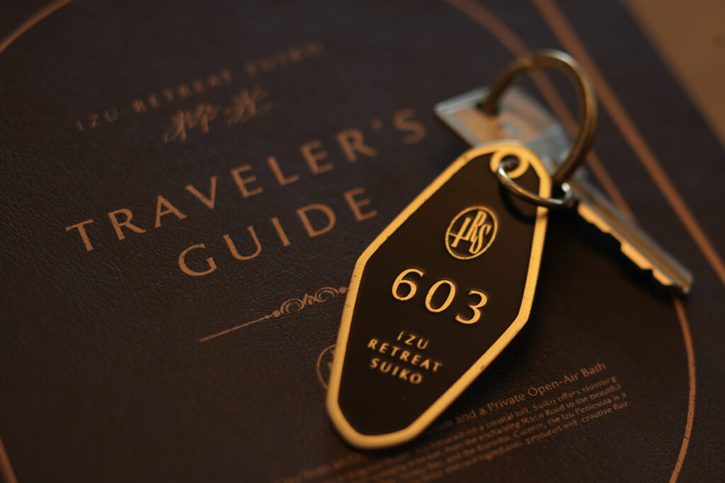 改装された客室は、全室オーシャンビュー。その全てに源泉掛け流しの露天風呂を据えた。さらに、これまで24室だった部屋割りをゆったりとした16室へと再構築し、それぞれの部屋に異なるデザインワークを施した。アクセントを添えるのは、モダナイズされた“昭和”の面影だ。壁にデザインされたペナントの装飾やアナログのルームキー、籐かごめ編みのキャビネットなど……。昭和の温泉街の原風景を感じるスパイスに、子ども時代の記憶の引き出しを覗き見るようで、懐かしさに気持ちがほどけゆく。