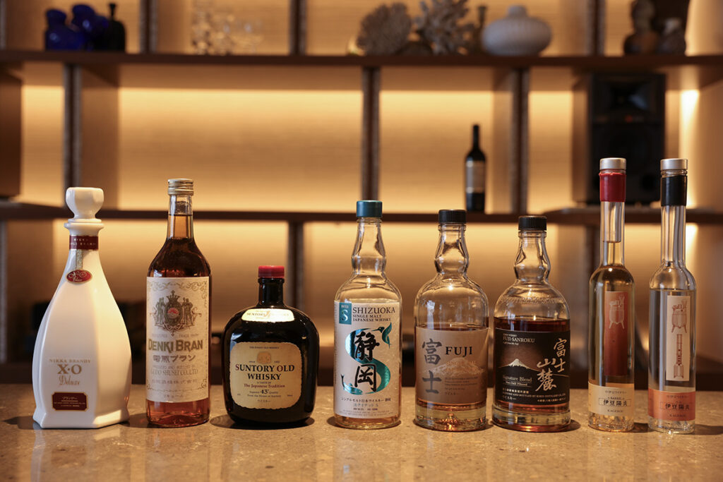 夕食前の宵どき、ラウンジではフリーフローが振舞われる。静岡県と縁のある日本酒やワイン、ウイスキーをはじめ、昔懐かしい電気ブランも揃う。桜の時期には河津桜の香のリキュールが、アペリティフタイムを華やかに彩って。