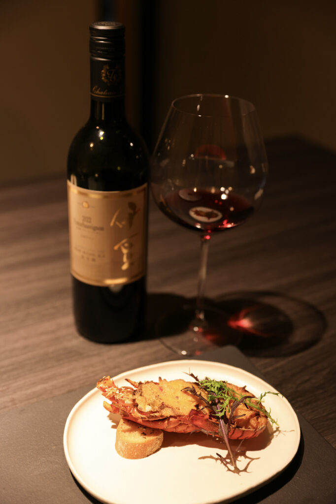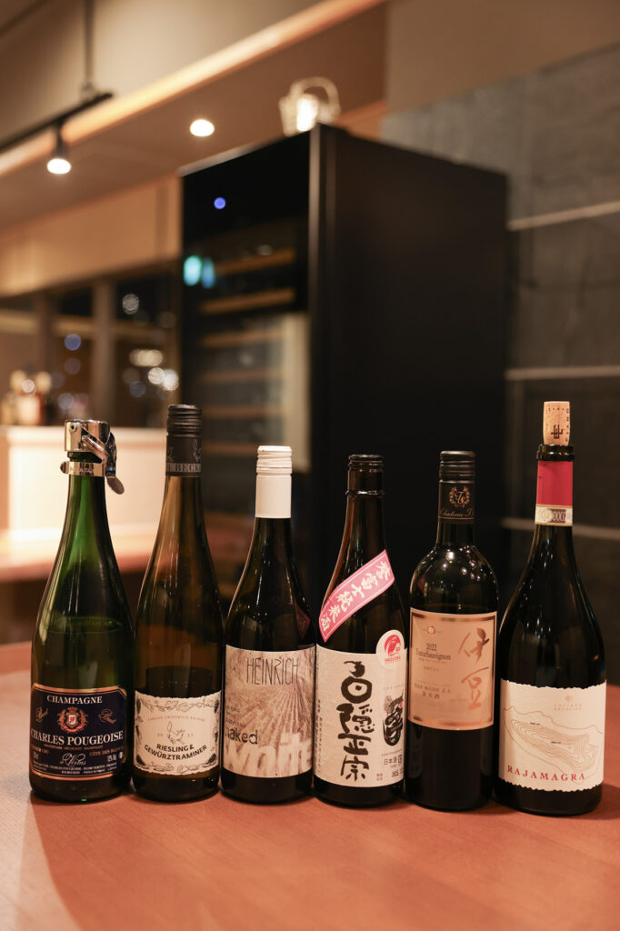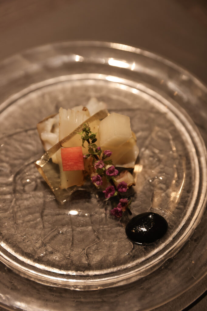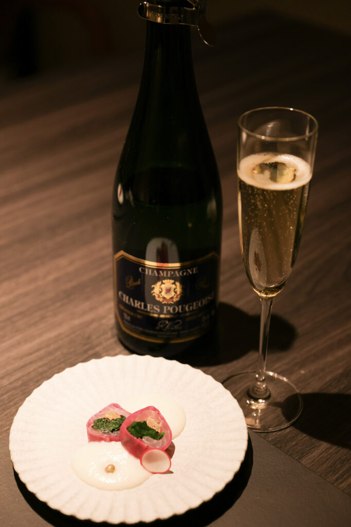 特筆すべきは、夜のコースのペアリングである。今回訪れた2月初旬は、全12品のコース料理の序曲に、真鯛の昆布締めとあん肝を赤い蕪で巻いた愛らしい一皿が登場。合わせた一杯は、シャルル・プジョワーズ・ブリュット プルミエクリュ。ポン酢をエスプーマしたソースと、シャルドネ本来のエレガントな爽やかさが繊細に溶け合い、続く料理への期待感が一気に高まる。カンパチや鮪漬けのお造りには、江戸時代から続く沼津の醸造所「高嶋酒造」の白隠正宗をペアリング。同じ日本酒を次の鮑のしゃぶしゃぶには、温酒で提供するなど、ゲストの反応やお酒の進み方に応じて塩梅を調整する心配りにも感服した。