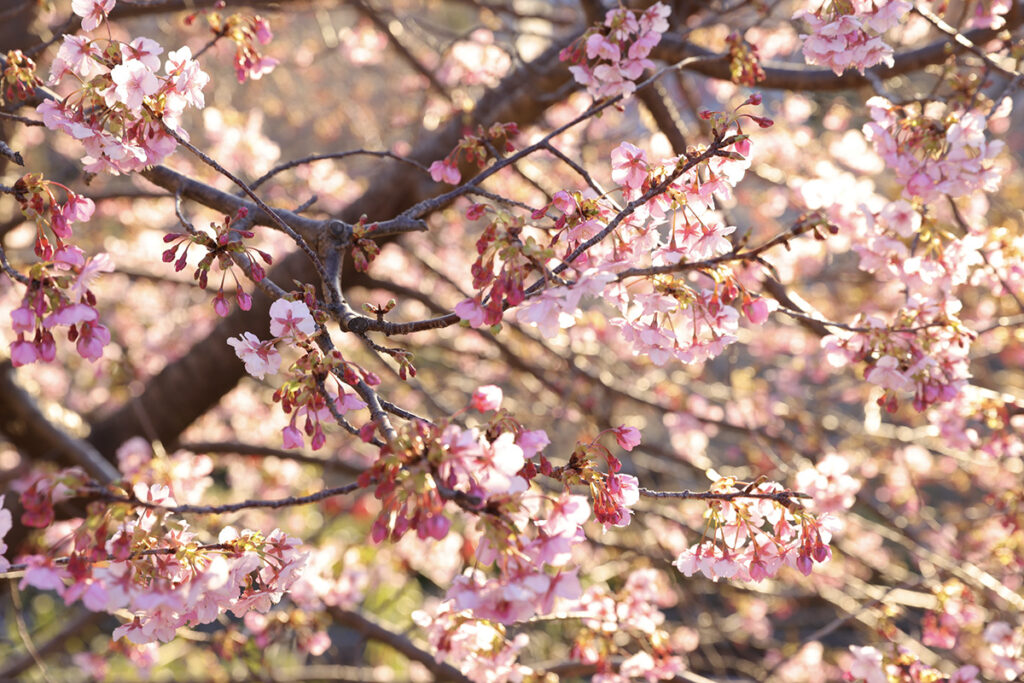 見知らぬ土地の美食体験から部屋へと戻り、暗闇に溶け込む潮騒を聞きながら再び湯に浸かった後は、気を失うように熟睡を迎えた。健やかなリトリート体験をした翌朝は、日の出とともに自然と目覚める。朝食前に周辺を散策すると、河津桜の花の便りを其処此処に見つけ心躍る。