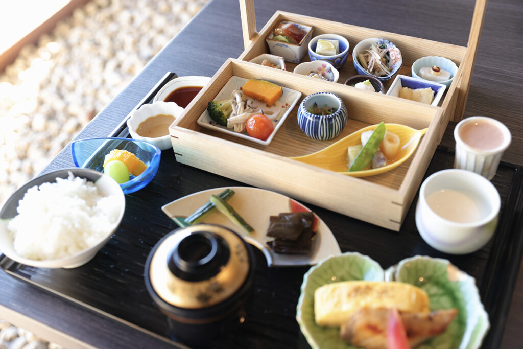 重ね箱スタイルの朝食には、伊豆牛蒡や里芋、椎茸といった山の幸と、鯵のナメロウや金目鯛の甘露煮、シイラ焼き、イナダの含め煮など地魚の海の幸が凝縮。小鉢を彩る逸品料理を、丁寧に箸でとりあげ、しっかりと咀嚼しながら深呼吸とともに味わう。ゆったりとした非日常の朝餉を終えると、気持ちが凜と日常へと向かってゆくのを感じた。わずか一泊の旅ではあったが、自分を慈しむことの大切さに気づけたのは、郷愁へと誘うような空間演出と大らかな海辺の魔法のせいだろうか。