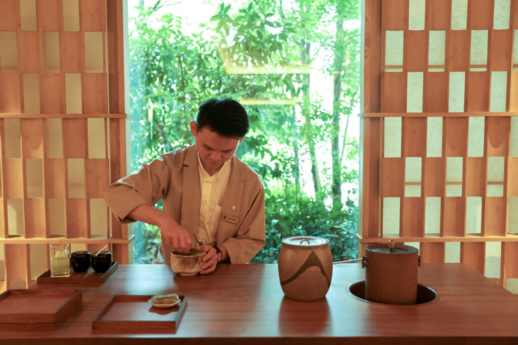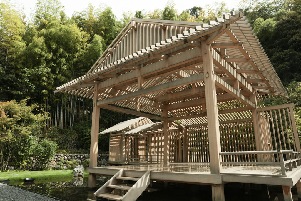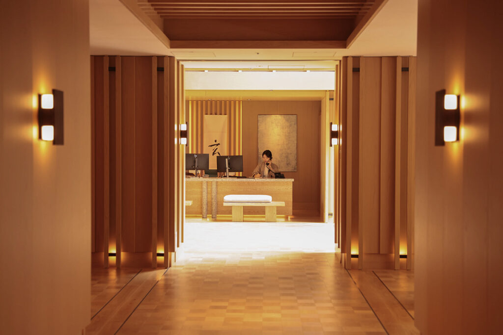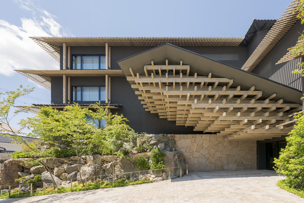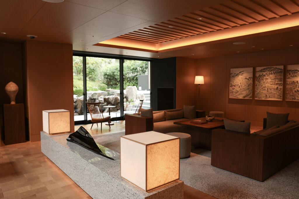 こうした格調高い温泉宿の風情は、建築のインスピレーションソースにも繋がる。世界的な建築家・隈研吾が率いる設計事務所が手がけた敷地の入り口を飾る大門や庇、ルーバーの木組みは、香り高い檜材を用いホテルをシンボリックに演出。墨色の外観と温もりのある白木を組み合わせることで、建物の輪郭を和らげて周囲の森に溶け込むようにデザインされている。