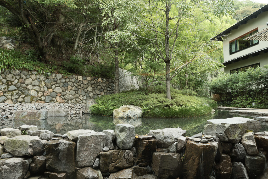 その“不易流行”の美学は、ロビーラウンジの視線の先に映る庭にも貫かれている。瑞々しい池の土台となる石組みは新たに造作されたものだが、奥の石組みは「ホテルりょうぜん」時代のもの。古の旅人が愛でた山桜の老木と、池のシンボルとして新たに植えられた枝垂れ桜とが、共にゲストを迎えているのだ。