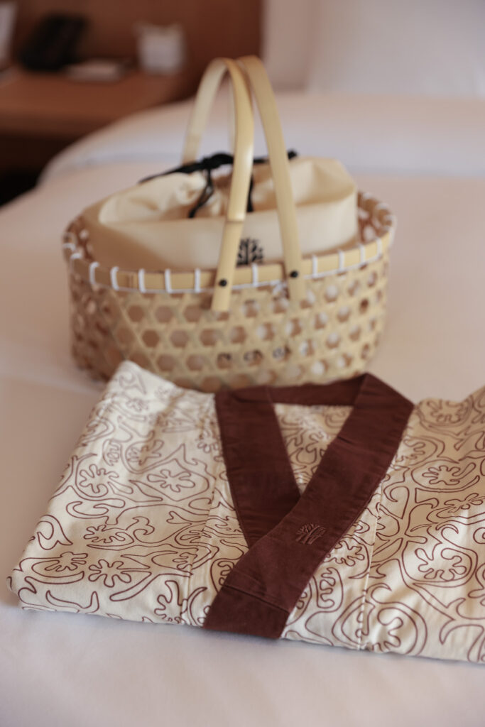 1枚目:ホテルのロゴをアレンジしたエキゾチックな浴衣。特性の籠バッグは大浴場へ行く際に重宝する。