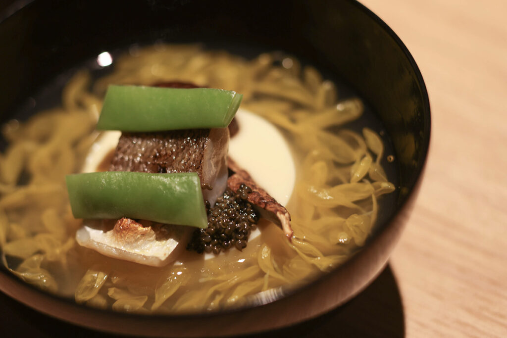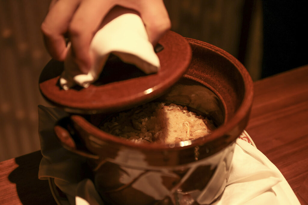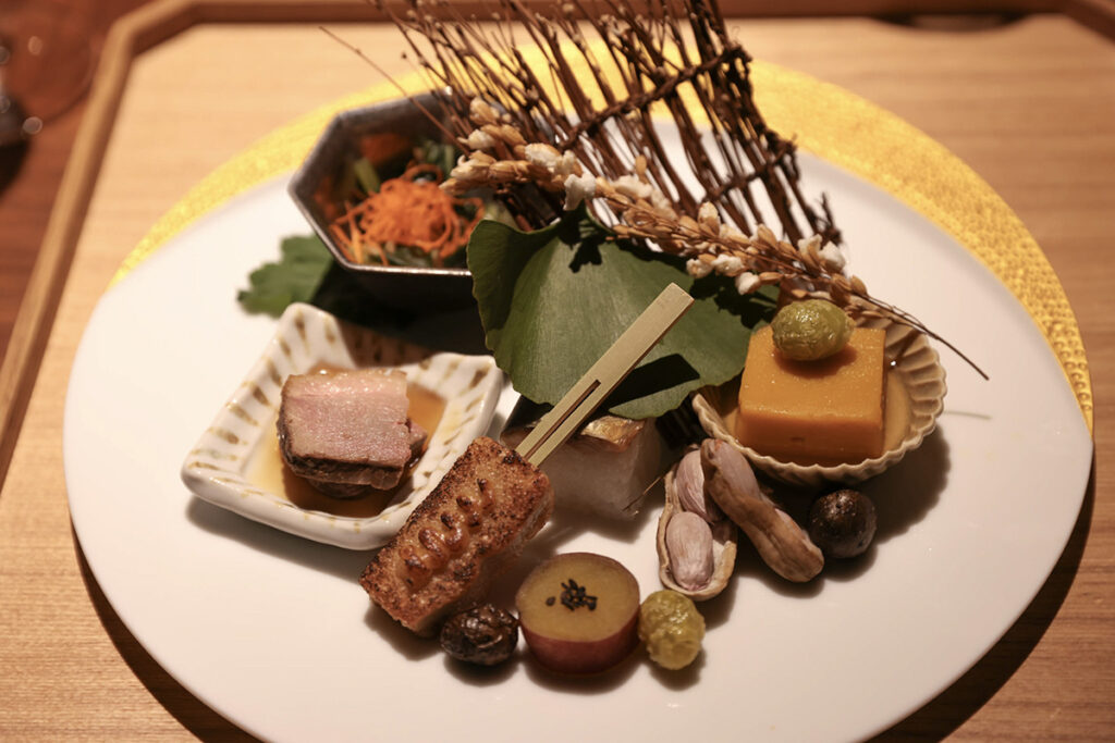 旅の記憶は、その土地の空気感と食べ物にある……食いしん坊の私だけでなく誰もが実感する旅の真価と言えるだろう。見知らぬ土地で美味しいものを求める嗅覚を働かせていると、料理を美味しそうに縁取る器とも出会える。そんな期待感を胸に訪れたのは、シグネチャーダイニング「割烹料理 りょうぜん」。時節柄、今宵は“月”をテーマに掲げた懐石料理が振舞われた。満月をイメージした皿に盛り合わせた前菜は、秋刀魚寿司や銀杏やむかごなど、深まる季節の食材に満ちている。続く椀ものの蓋をあけると、鮮やかな菊が月の輝きを放つ。黒毛和牛のフィレステーキや甘鯛の湯葉蒸しなど、贅を尽くしたコースを締めくくるのは、土鍋でふっくらと炊き上げた松茸ご飯だ。