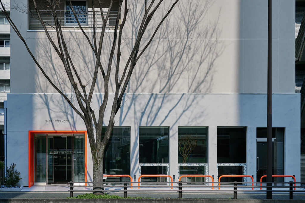 JR博多駅からタクシーで8分、または地下鉄の渡辺通から徒歩7分という便利なアクセス。おしゃれなショップや飲食店が点在する薬院や、福岡らしい風情ある屋台の立ち並ぶ天神など、繁華街も徒歩圏内。街歩きが楽しい福岡を存分に堪能できる好立地だ。白地にオレンジカラーがアクセントの個性的なファサードが目を引くモダンな建物。2025年名古屋にオープンした「ベースレイヤーホテル」の2拠点目となる。