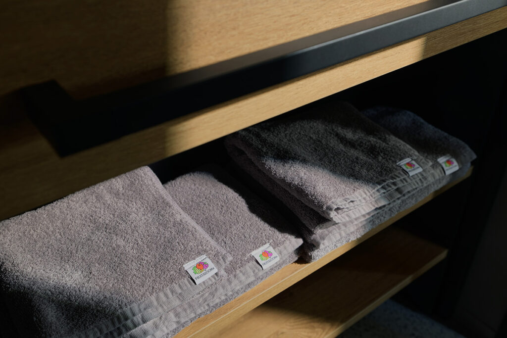客室のアメニティにも注目したい。ベッドリネンやパジャマ、タオル、バスマットは、アパレルやアンダーウエアとして着心地良さに定評あるアメリカのブランド「フルーツ オブ ザ ルーム」のものを全室で採用。ホテルに採用されるのは世界初である。また一部客室のシャンプー、トリートメント、ボディウォッシュ、ハンドウォッシュなどには、環境に配慮し、サステナブルなものづくりを目指すブランド「athletia(アスレティア)」のアメニティが設置されている。