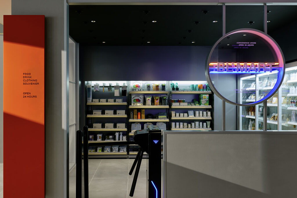 1Fのフロント前には無人のコンビニ「BL MART(ビーエル マート)」がある。キャッシュレス決済を導入しており、スマホの専用アプリで入室や支払いがスムーズにできる。店内には福岡県糸島市にあるこだわりの酒屋「川久保酒店」が選定するドリンクや、九州のローカルスナック、BASE LAYER HOTELオリジナルグッズ、「ジェイソンマーク」のシューケアーセットなど旅のお役立ちグッズまで、様々なアイテムが並んでいて、ちょっとしたお土産探しにも便利。コンビニというよりむしろセレクトショップといえる捻りの利いた独自の品揃えである。ここは宿泊者以外も、24時間誰でも利用が可能だ。