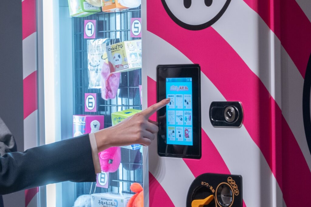 サンデン・リテールシステム株式会社が開発したこの自動販売機型マシーンは、1台で最大12シリーズまで同時に取り扱い可能で、タッチパネルで希望の商品を選択しガチャガチャができる。カプセルも不要なので、ぬいぐるみなどの大型の商品も扱えるのが強みだ。さらに、キャッシュレス決済対応となっており、小銭や両替も必要ない。