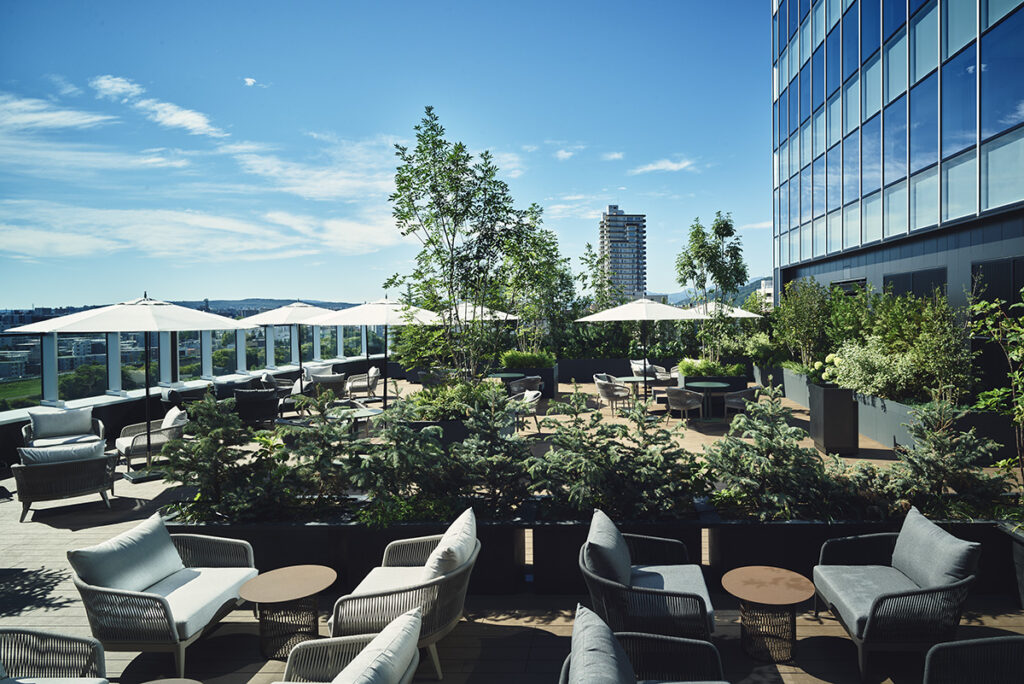 洗練された都市空間の中にありながら、ロビーのある9階にはテラス席を設け、四季折々の自然の気配を肌で感じることができる。さらに、水盤を配した室内のロビーラウンジには清らかな水の音が流れ、暖炉の備わったファイヤーラウンジ、緑に囲まれたラウンジエリアが連続的に広がる。インテリアの細部に至っても北海道産木材や石材が用いられ、日常を離れた静謐さと心安らぐ寛ぎがシームレスに溶け合っている。