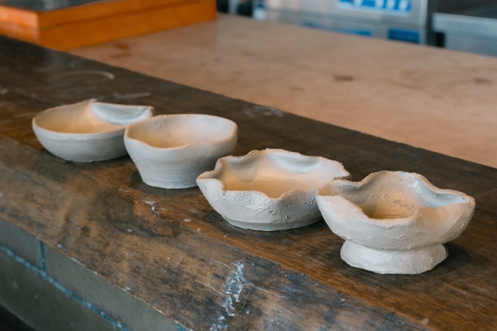 スタッフの方が丁寧に指導してくれるため、初心者でも安心。分からないことや作りたい形があれば、その場でアドバイスしてもらえる。実際、これまでの参加者の約8割が陶芸初心者だそうだ。私自身もろくろを使った陶芸は初めてだったが、1時間ほどの体験で小皿2つとお猪口1つを作ることができた。サイズも小ぶりなので、少しくらい形が崩れてもそれもまた個性と楽しめるのもミニろくろならではの魅力だろう。