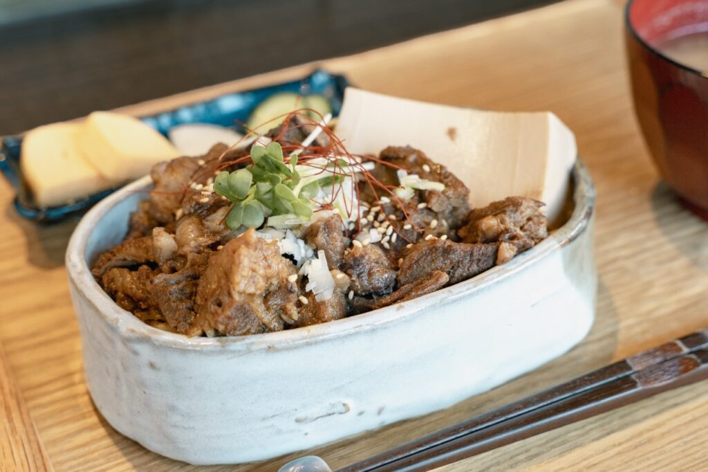 陶芸体験が終われば、炊きたてのご飯が待っている。土鍋で炊いたご飯と、日本各地の郷土料理が楽しめる仕様。お重の内容は季節で変わり、取材時は「和牛すじ重」または「めんたいこ重」のどちらかを選択できた。食事で使用されている食器類はもちろん陶器で、スタッフさんが焼いた一点物だ。自分で器を作ったあとに陶器の食器で食事を楽しむことで、陶芸の余韻をそのまま味わえるのもこの店ならではだろう。
