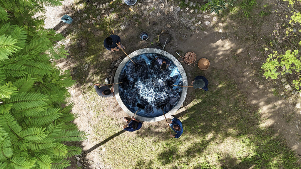 たとえば、工房にとって大きな仕事のひとつは、藍を育て、藍を染めること。土を耕し、種をまき、育ったインド藍を収穫し、その水瓶で藍の葉から泥藍を作る。「ganga maki」の布づくりの根底ともいえる藍の営みからは、気候の移ろいや土地の呼吸を含む作品「Indigo Galaxy(藍の銀河)」が誕生。また、作品「Sadred Skirt(聖なるスカート)」は、工房の敷地に根を下ろし、すくすくと育つ糸芭蕉の木から想起。自然の生命力と偉大さを、大地(Mother Earth)の衣=巨大な巻きスカートとして創出した。