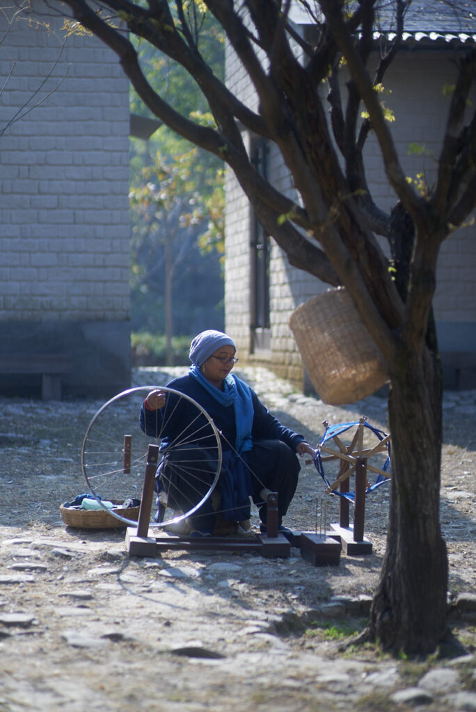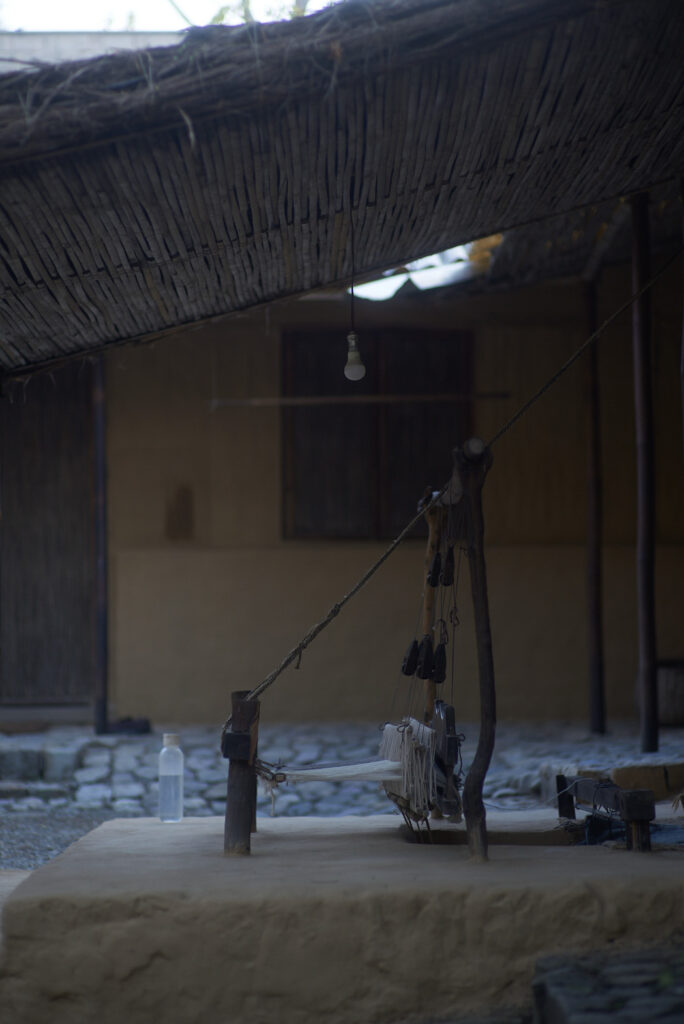 ganga maki工房の建物は土からなる。機械化に頼らず、伝統的な道具で糸巻きをする様子に、染織の原風景をみるようだ。