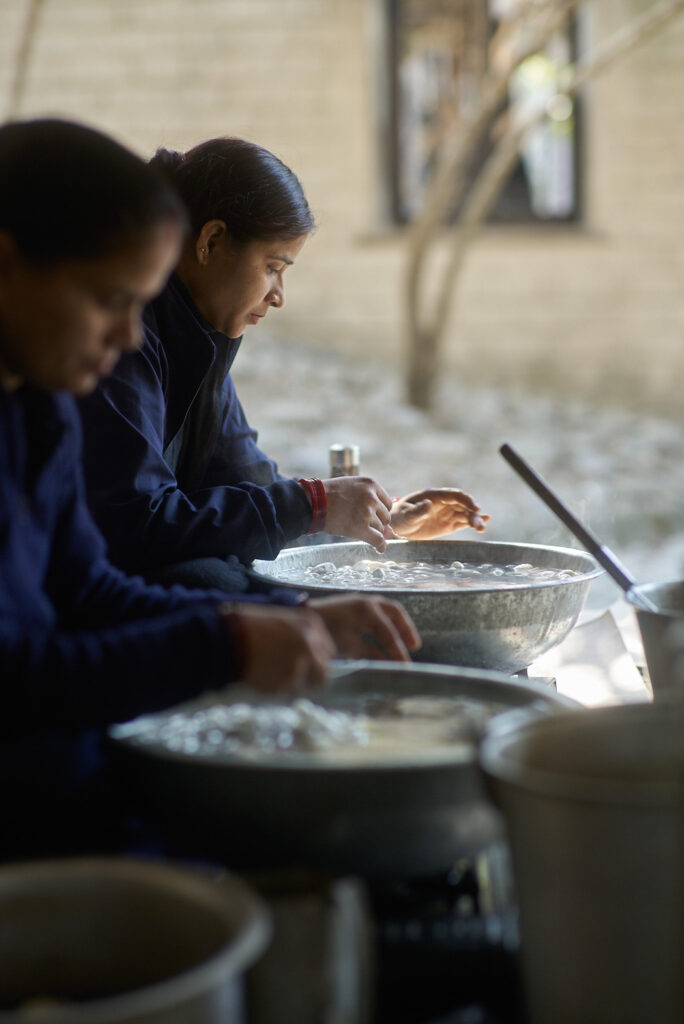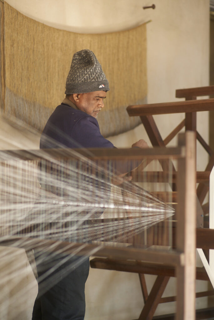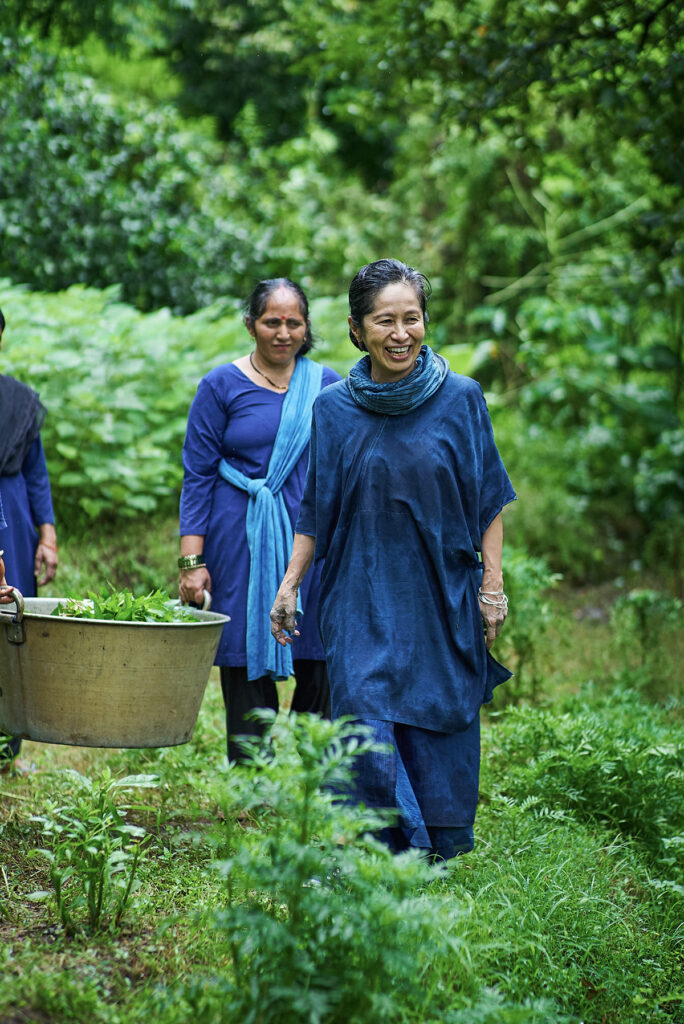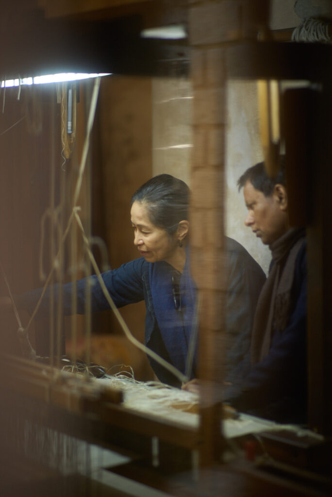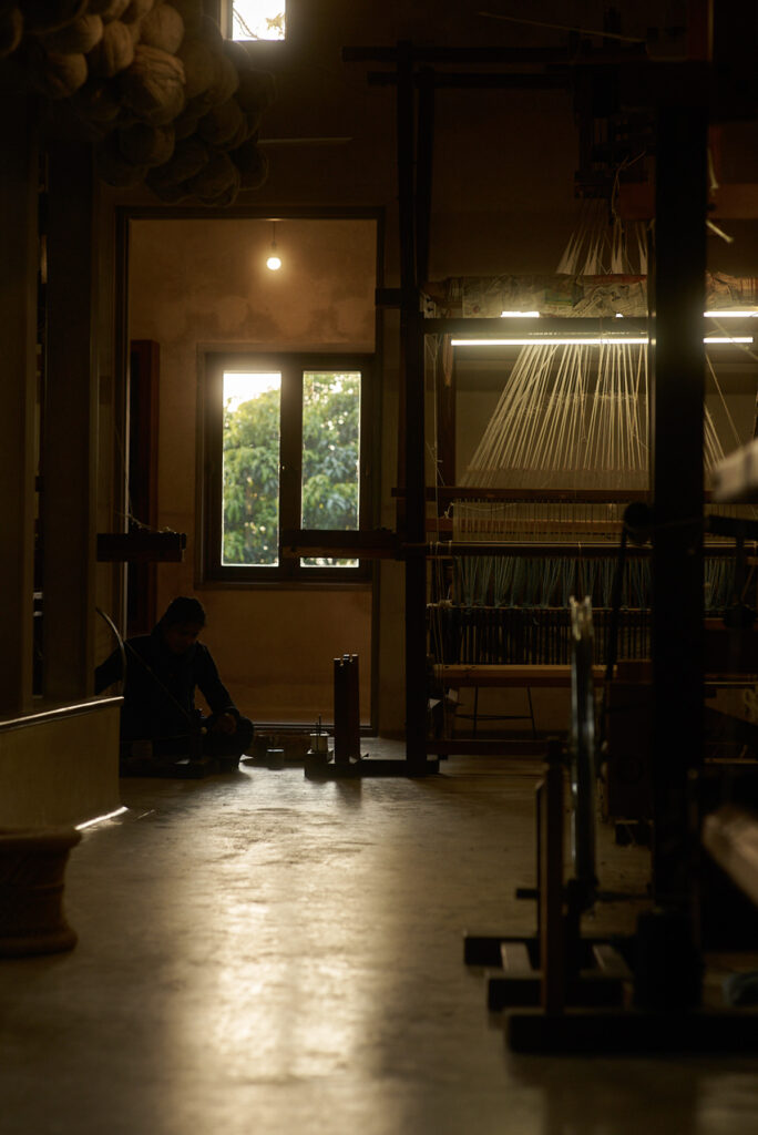 「織物は暮らしの中で生き、使われるものがいちばん愛おしい」と考え、衣服やストール、インテリアファブリックなど、用途のある織物づくりを続けてきた真木さん。「ganga maki」の敷地や周囲に広がる農地では、芭蕉や苧麻などの繊維植物、インド藍やインド夜香木、ザクロ、メヘンディ(ヘナ)といった染色植物を自家栽培している。工房の内部では、“ずり出し”と呼ばれる手法により、生糸が手挽きされ、藍甕(あいがめ)の中では藍がふつふつと発酵。さまざまな家蚕や野蚕の繭、遊牧民の村で手刈りされたウールなど、天然繊維から糸を紡ぎ、染め、織る──。素材となる植物を育て、日々収穫し、素材にしていく暮らしを重ねるうちに、何気ない工程の中で「美しい」と感じる瞬間が連続して現れるようになったという。