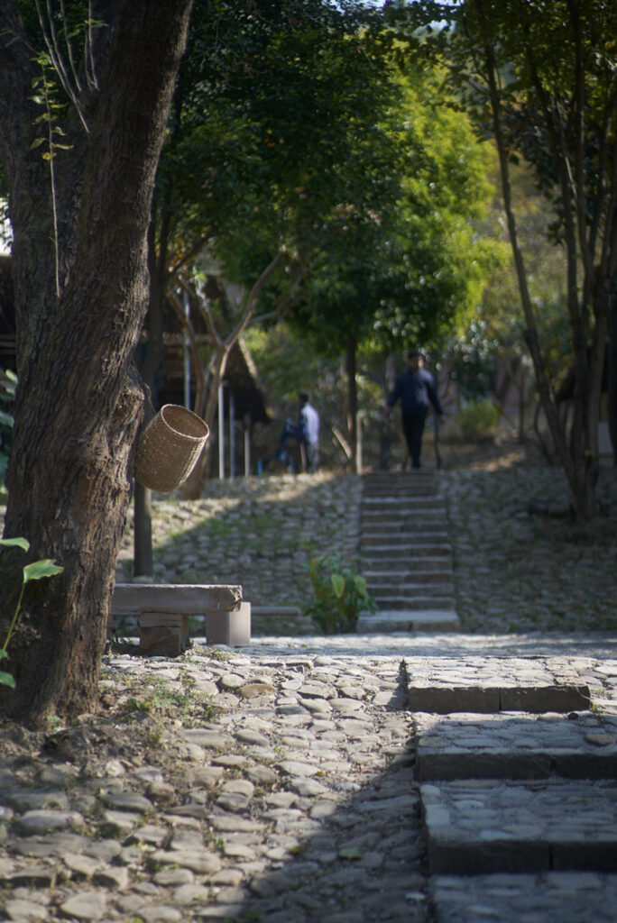 染織の源流を求め、2009年に真木さんが辿り着いたのは北インドのヒマラヤ山麓デラドゥン。そこに構えた「ganga」工房で約17年に及ぶ創作活動を歩んだのち、より大地に根差した素材の力を求め、2012年に新たな土地を得る。建築空間を設計したのは、世界的に知られるインドの建築家ビジョイ・ジェイン主宰の「スタジオ・ムンバイ」だ。3000坪という広大な土地を訪れた建築家ビジョイ・ジェインは、周囲の景観や大地の起伏を日々観察。建物の中心に月や星を映し出す池のような水瓶を作ることを決め、その周りに木陰をもたらすように2年がかりで木の苗を植えた。さらに、土や石、石灰や煉瓦、竹に至るまで、工房から半径2km以内の素材にこだわり、伝統的な手法を周囲の環境と調和するように設計。新工房「ganga maki」が完成したのは着工から5年後の2017年である。現代の時間の流れと反比例しながらも、自然がもたらす素材を伝統の手法を用いながら現代に生かすという建築の在り方は、真木さんの創作活動とも通じる。