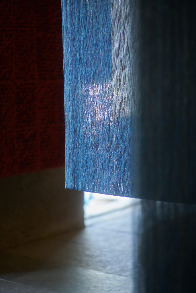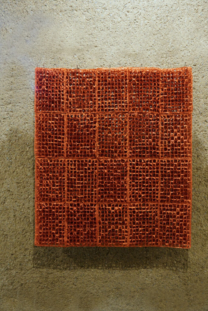 3枚目:「Dancing Basho」(芭蕉・苧麻、縦140 ×横 120 × 奥行20cm)糸。芭蕉の木を余すことなく使いきってきた芭蕉紙を茜で染め、敷地内の苧麻(ちょま)の繊維で格子を織り、漉き上げた。