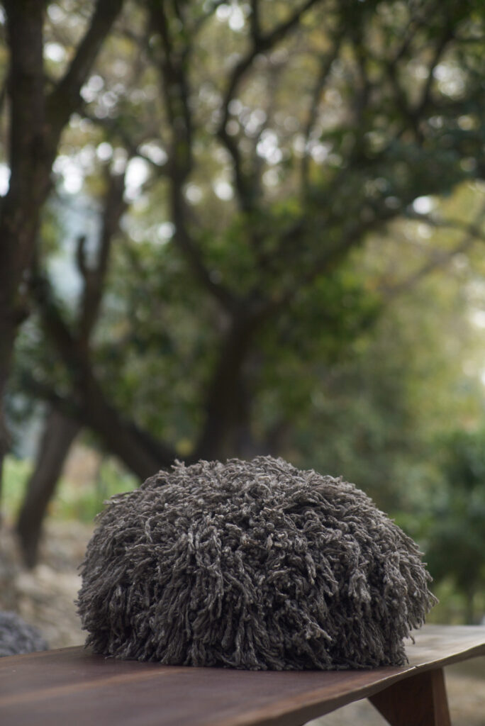 2枚目:「Himalayn Cloud」(手紡ぎヒマラヤウール、直径85×98 × 高さ43cm)。ふくふくした毛足が空気を含み、雲のように静かに佇む。触覚が呼び起こす温度と余白が、素材そのものの気配を浮かび上がらせるよう。