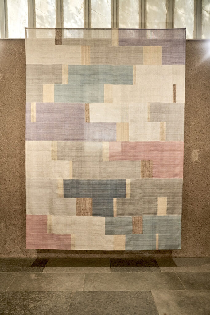 4枚目:「Plant Breath」(手挽き絹 ・野蚕タッサーシルク・苧麻、縦385 x横 272cm)。植物の色と気配が布の中に静かに重なり、光とともに呼吸するような表情に。