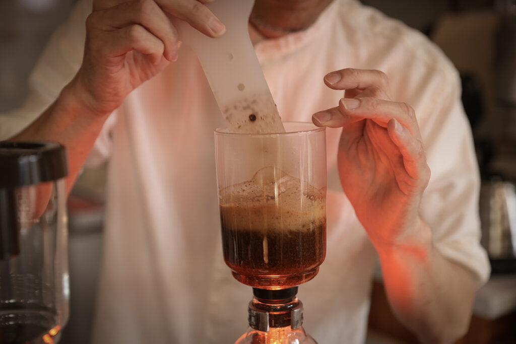 香りが変化する3段階のタイミングを見極め、ロートの中のコーヒーを撹拌することがサイフォンでの抽出のポイントだという。高温と中温時は香りが飛びやすいため集中力を要する。最後の低温時には、最初の2段階の輪郭をなぞるように優しく撹拌する。「コーヒーの味は9割が香り。淹れた瞬間から気体と化す香りをサイフォンなら、短時間で存分に取り込むことがでる」と、器具の魅力を繰り返し解く。この日オーダーした究極の一杯は、マレーシアの「リベリカ JHプロセス」。透明感のある味わいに、トップノートからラストノートまで変化するフレグランスのように、繊細な香りが溶け込んでいた。