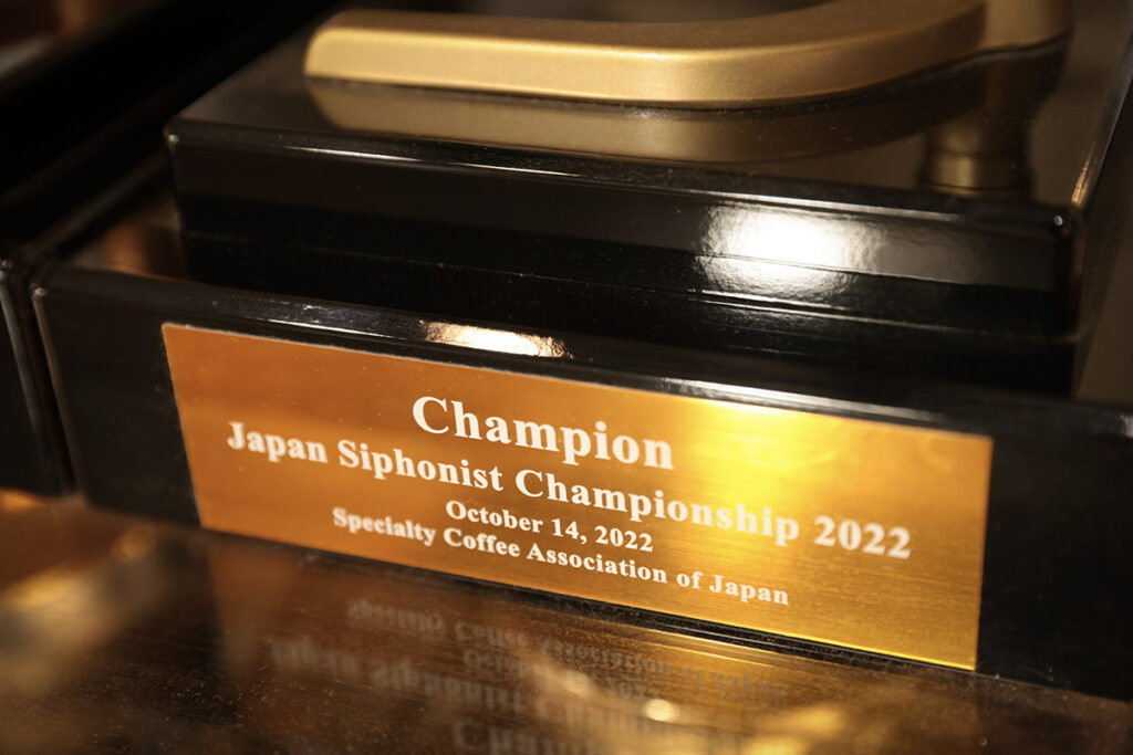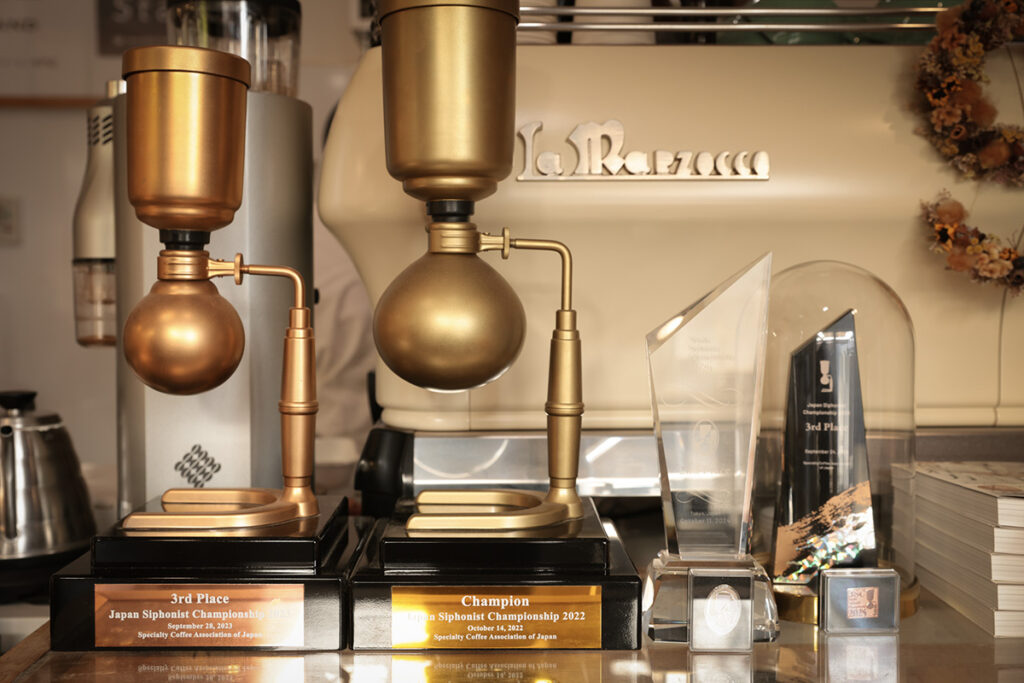 数々の大会で得たトロフィーもサイフォンの形状を模して。インテリアのスパイスとしても目を引く。