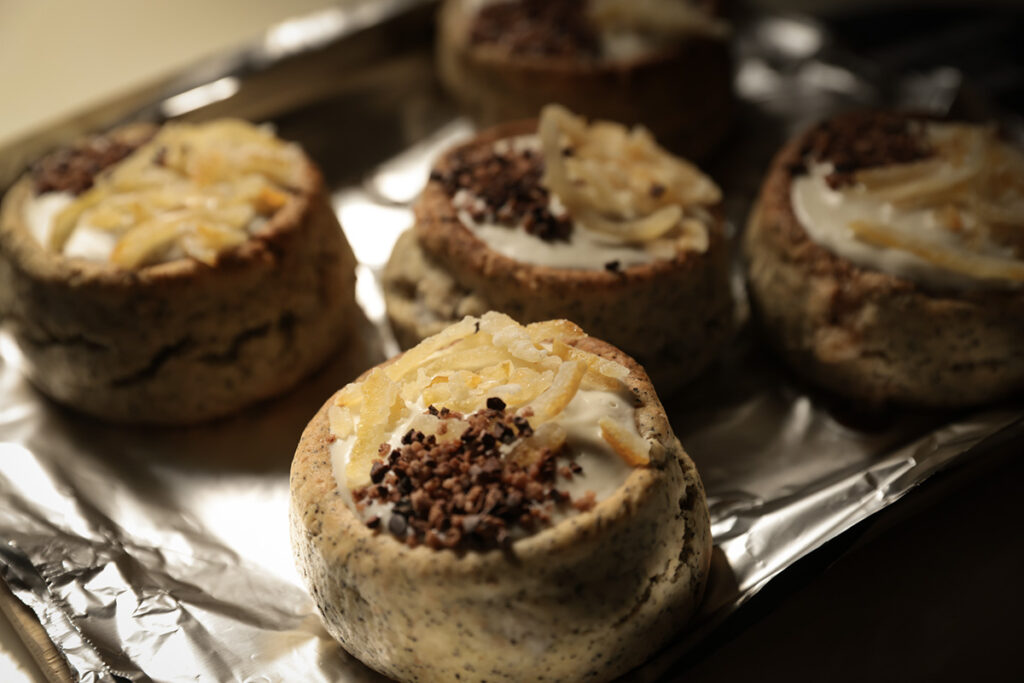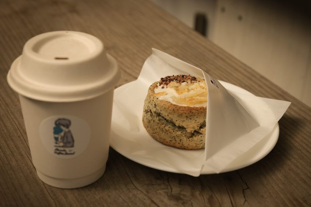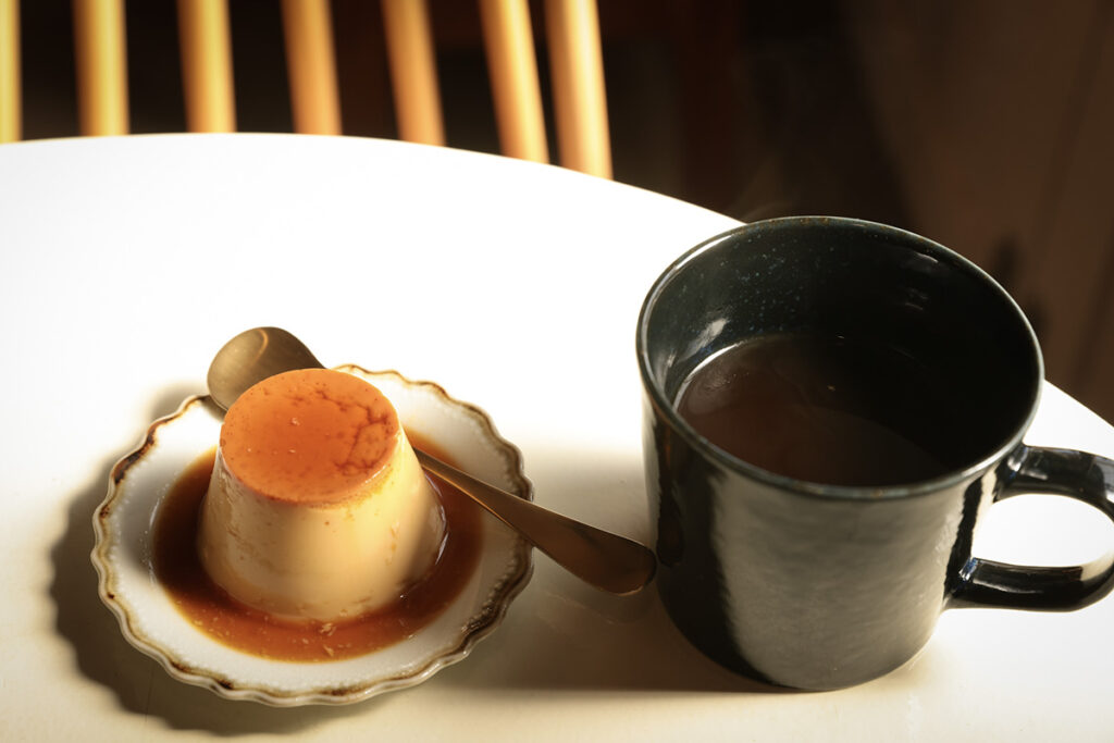 さらに、コーヒーの相棒として朝から焼くスコーンやプリンも、近藤氏がトライしたこだわりのひとつ。「凝り性なので、まだまだ進化の途中です」と言いながらも、オーダーしたスコーンの味わいは、その価格を遥かに超えるクオリティーだ。アールグレーのスコーンには、ホワイトチョコを練り込み、レモンピールとカカオニブのキャラメリゼをトッピング。スコーン特有のパサつき感がなく、リッチな口当たりがフルーティなコーヒーと好相性だ。コロナ禍に腕を磨いたという蒸しプリンも、イノセントな懐かしさに深いコクが追いかけてくる。