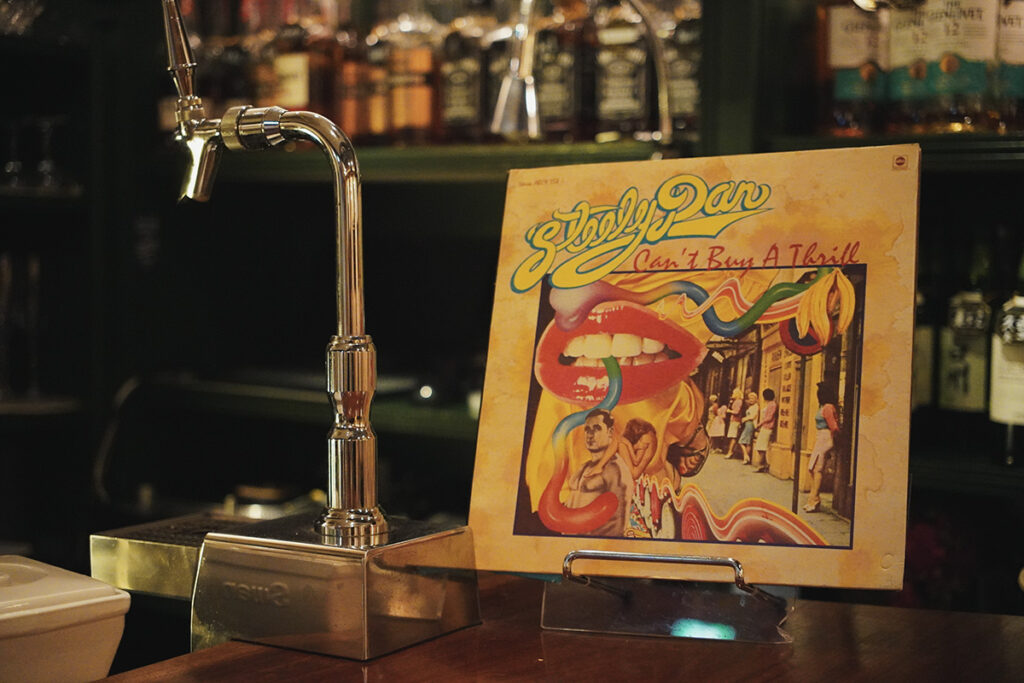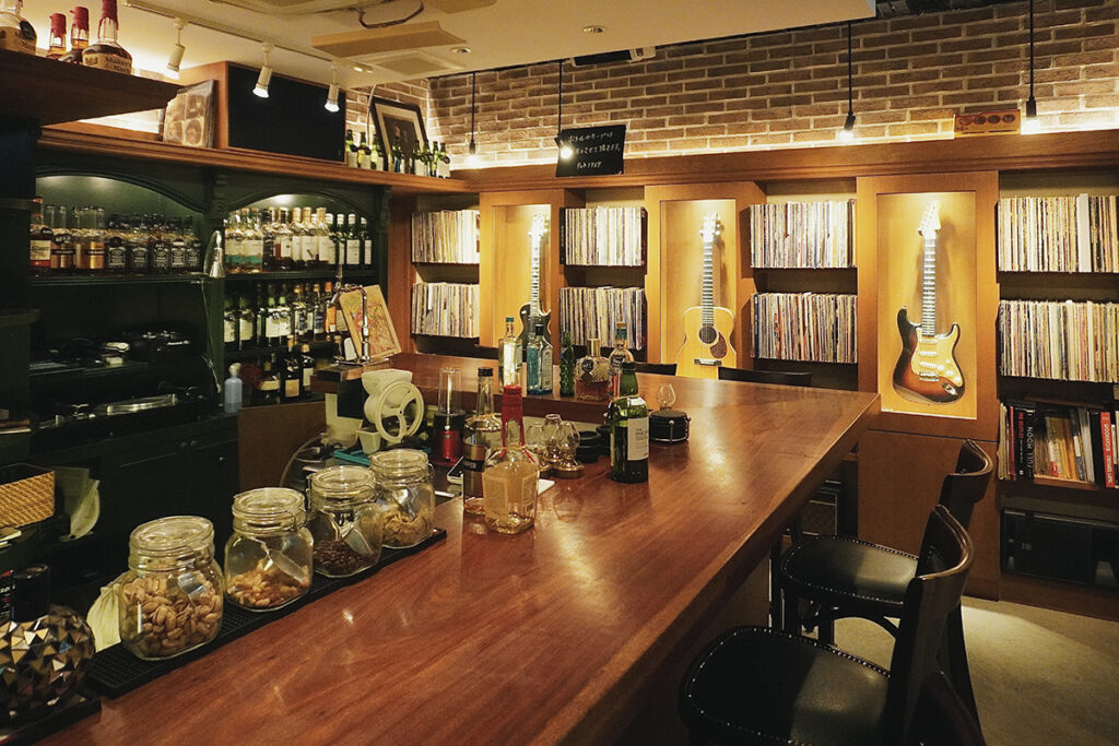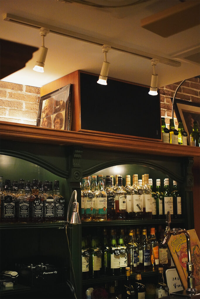 壁にはYouTubeのコンサート映像が投影され、店内に漂う音楽に視覚的な奥行きを与えている。早川氏が所有する約3,000枚のレコードコレクションもすぐ手の届く場所にあり、客のリクエストがあれば快く再生してくれる。選曲はクラシック・ロックが中心だが、時には古いソウルやジャズがターンテーブルを彩ることもある。音響をじっくり楽しみたいなら、奥のテーブル席が最高のリスニングスポットだ。そこでは両方のスピーカーから流れる音が、完璧なバランスで耳に届く。