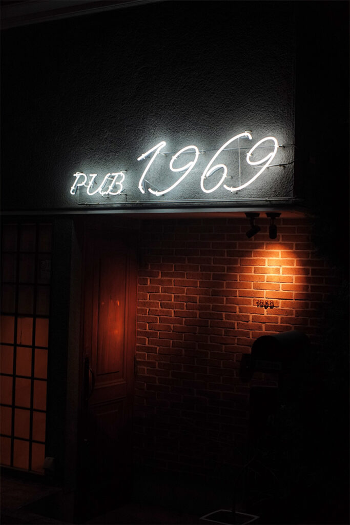 恵比寿は、洗練された街というイメージがある一方で、小規模で居心地の良い飲食店がひしめく街としても知られる。渋谷から徒歩圏内でありながら喧騒は少なく、落ち着いた魅力が漂う。東口から恵比寿通りを白金方面に歩くこと約10分。住宅街の中に、ネオンサインと波打つ窓ガラスが優しく光る「Pub1969」が現れる。扉を開ければ、クラシックなパブスタイルの温かいインテリアが、しばし東京の日常を忘れさせてくれる。