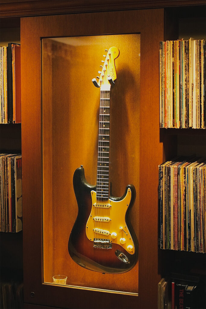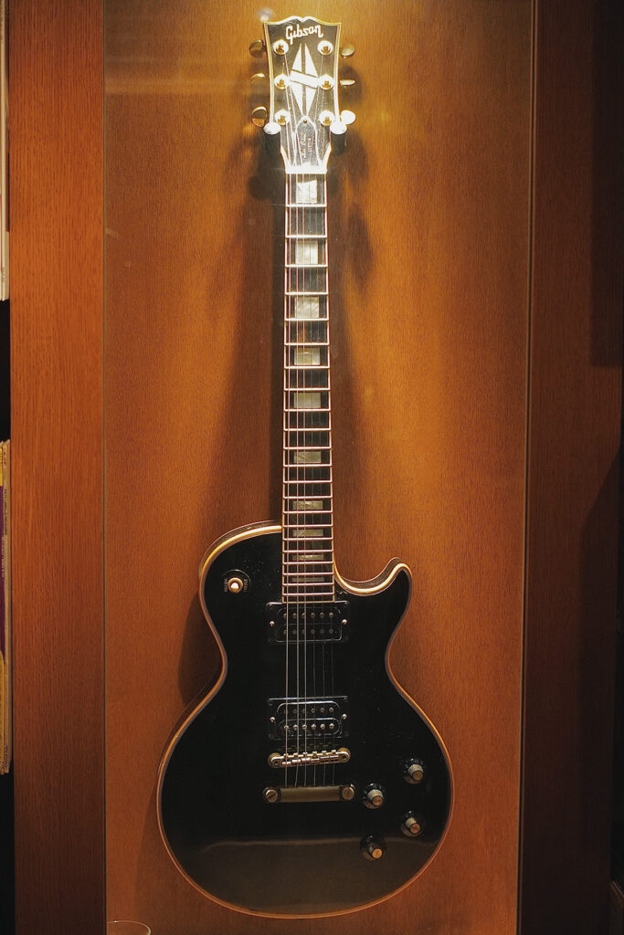2枚目: 展示されているフェンダーのギター。早川氏が高校生の時に手に入れた一本