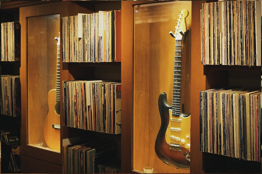 「Pub1969」があるのは、早川氏の自宅のガレージだった部分だ。深緑に塗られた棚や、レンガと漆喰の壁が、ロンドンのパブを思わせる。壁にはレコード棚が並び、柱の間には早川氏のコレクションであるギターが飾られている。15〜16台ほど所持しているそうで、時折入れ替えも行われるという。カウンターの奥にはウイスキーやバーボンが整然と並んでいる。