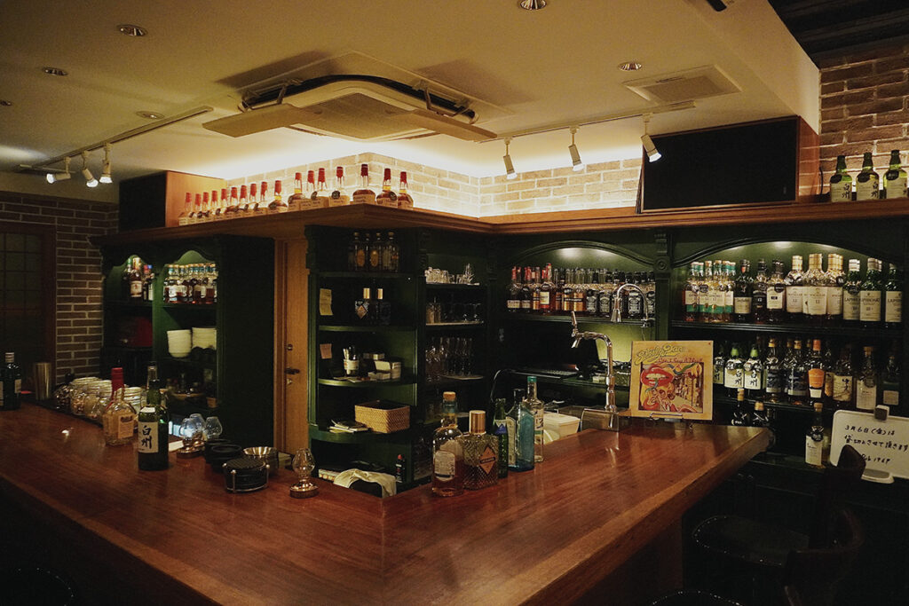 カウンターの奥にあるドリンクの選択肢は極めてシンプル。生ビールや様々なスピリッツが用意されているが、主役はウイスキーである。「イチローズモルト」や「マルスウイスキー」といったジャパニーズウイスキーは、海外の客からも好まれる。また、「シーバスリーガル」や「メーカーズマーク」といった定番に加え、限定版の銘柄が登場することもある。