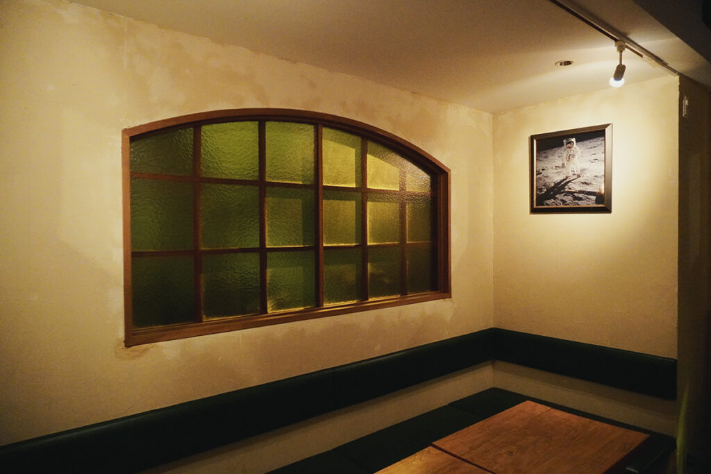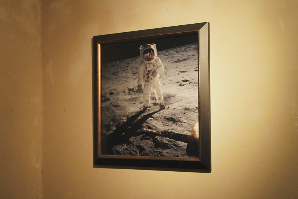 ソファ席は最高の音響体験ができる。壁にはアポロ11号の月面着陸の写真が飾られている。