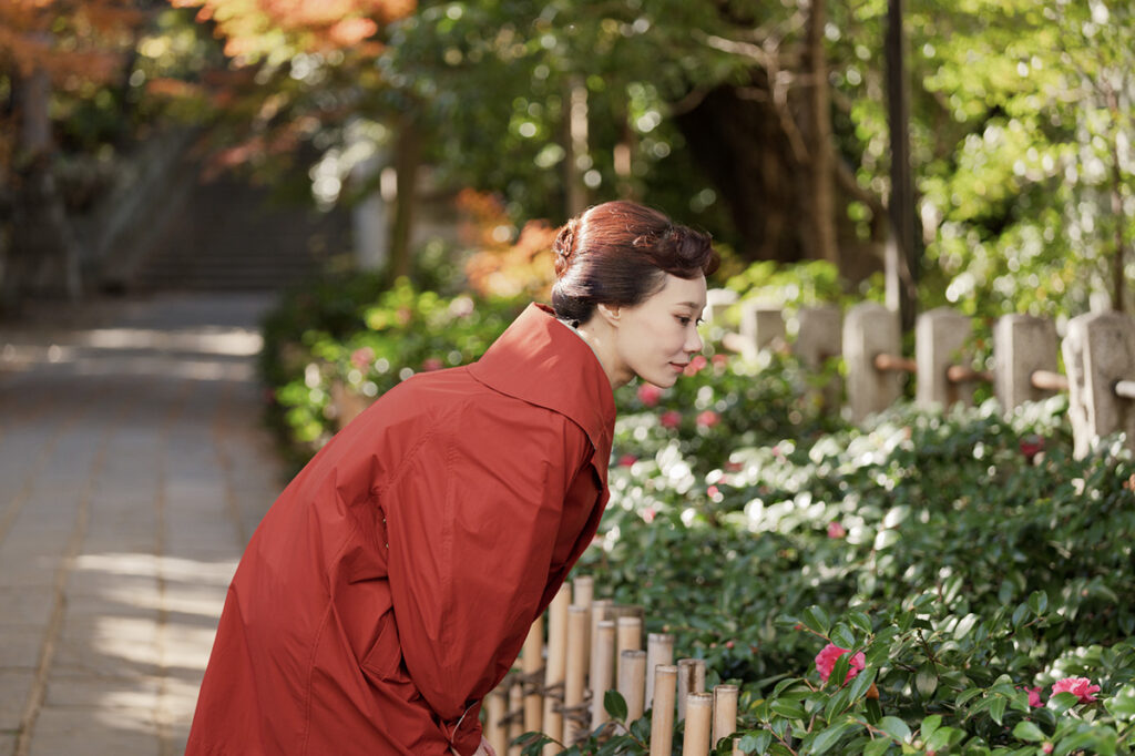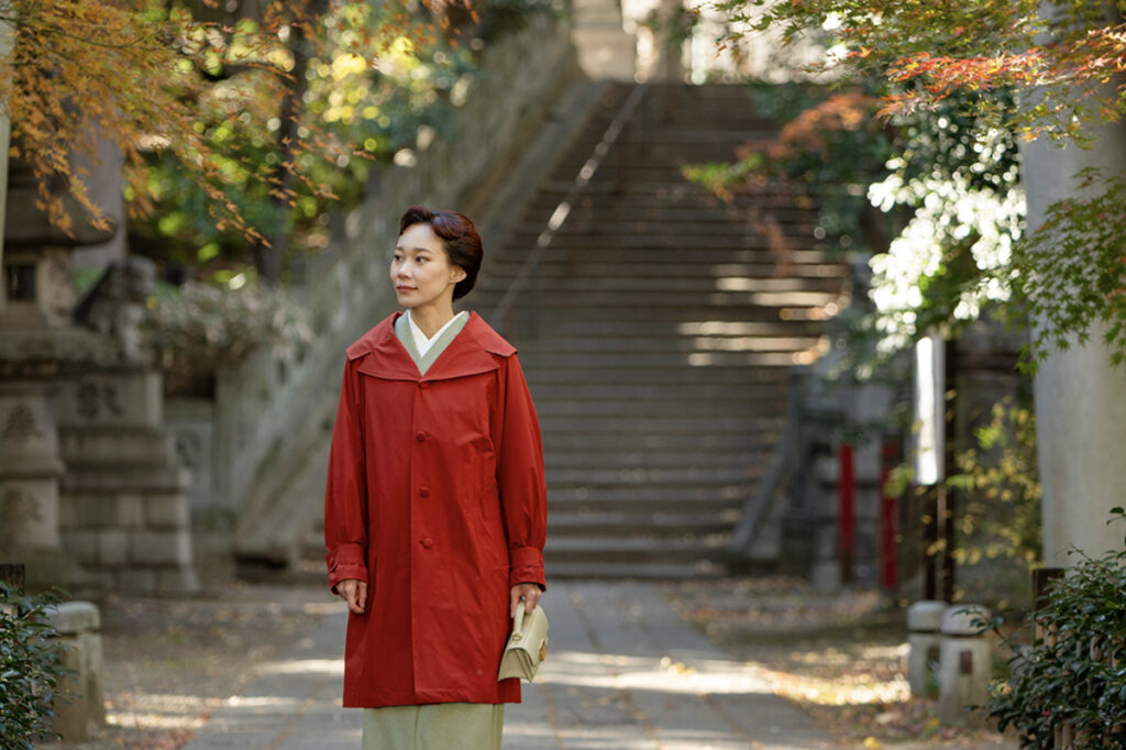 静謐な空間に鮮やかに映えるバーガンディカラーのコートは、自身がデザインに携わった「KOTOWA」の新作[mulci coat]