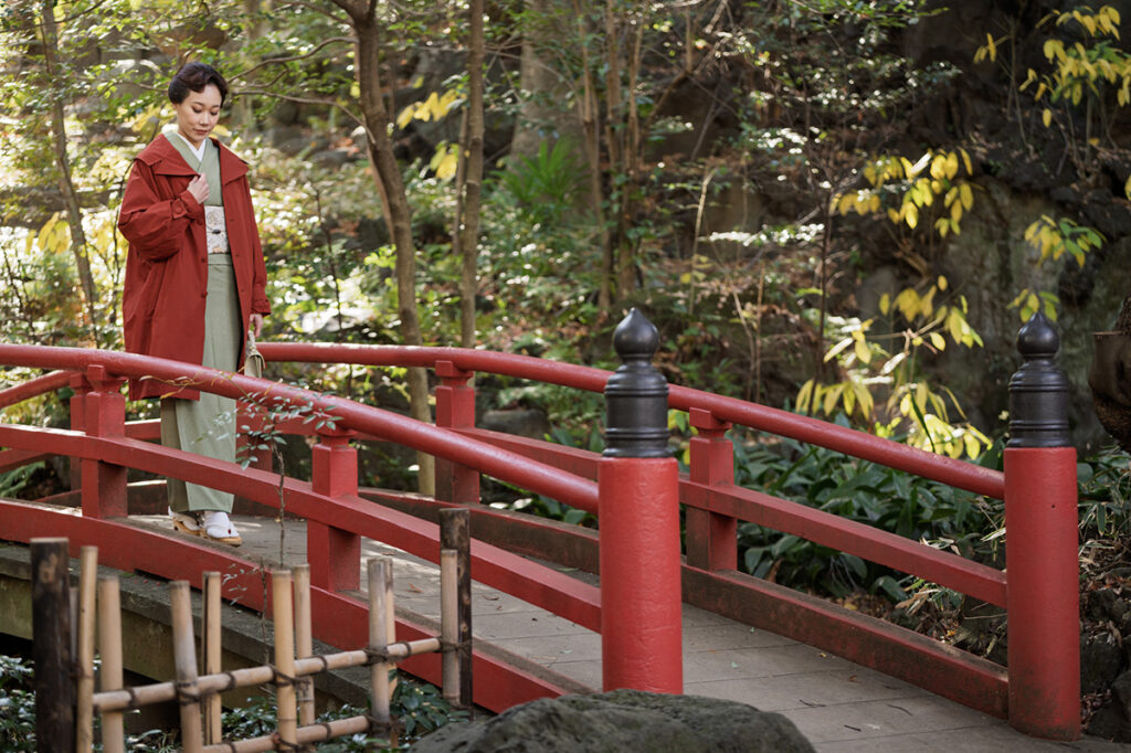 DJとしてファッションシーンで活躍しながら、着物のプロデュースも手掛けるなど多彩な顔を持つマドモアゼル・ユリアさん。アートや建築にも精通したユリアさんが、お気に入りのスポットを訪ね、その場面と響き合う着物のコーディネートを語る連載。2026年を迎えた最初の回は、江戸時代からの石段や社殿が残る「赤坂氷川神社」へ。吉祥の願いを込めた着物姿とともにお届けする。