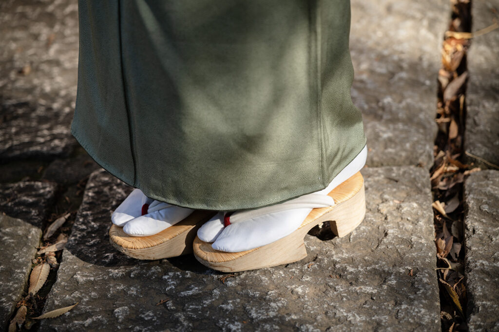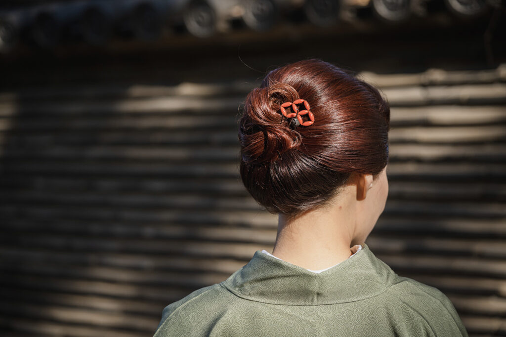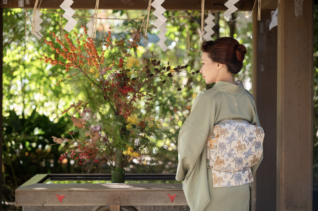 獅子舞の帯留めや七宝繋ぎの簪、畳表の履き物など、ディテールまで美意識が宿る