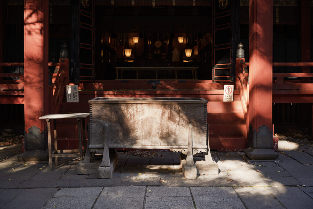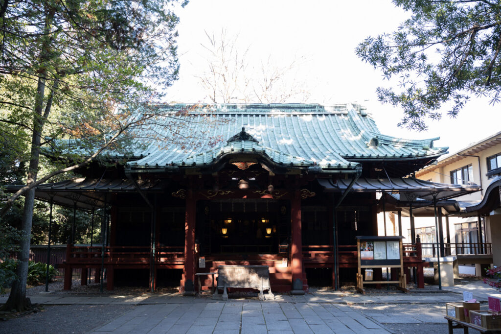 さらに、1730年には8代将軍吉宗公が社殿を建立。14代家茂公まで歴代将軍の朱印状が下付されるなど、将軍家との縁の深い神社として今もその姿を残す。1976年に東京都の有形文化財(建造物)に指定された社殿は、建築当時の質素倹約の気風を表していながら、大きな雲形組物や吹寄せ垂木など、微細な意匠に江戸の雅味が込められている。内部の壁には、1929年に宮部衆芳によって「鳳凰図」が描かれ、こちらは東京都の重要文化財に指定。格天井の豪奢な花鳥図とともに、荘厳な社殿の内に華やぎを秘めている。