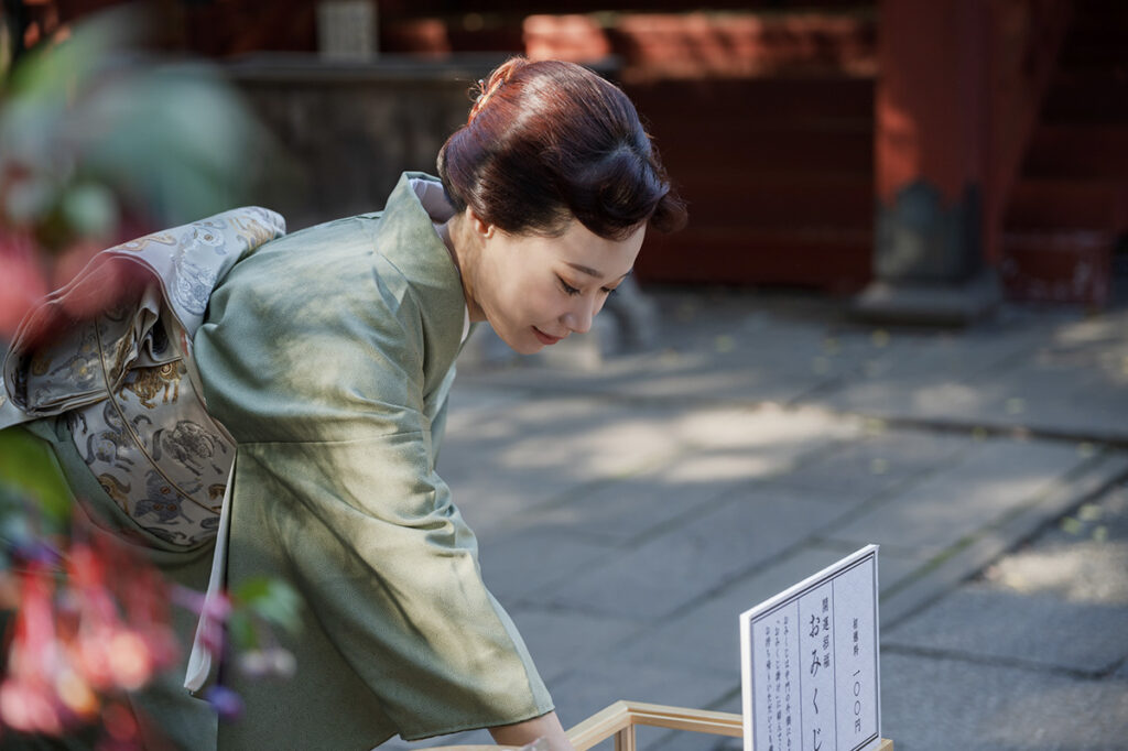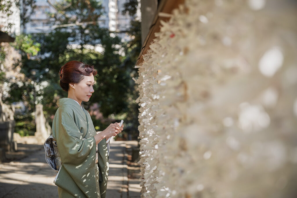 御祭神として祀られているのは、素盞嗚尊(スサノオノミコト)と奇稲田姫命(クシナダヒメ)の夫婦神ということから、東京三大縁結び神社として知られている。また、男女のご縁だけでなく友人、仕事、子宝に至るまで、あらゆる「結び」の神である大己貴命(オオナムチノミコト)も祀られており、商売繁盛や厄除けのご利益も。仕事でもプライベートでも、“人とのご縁”を大切にしているユリアさん。2025年の12月に、ユリアさんにとって初めての著書『きもののとりこ』(世界文化社刊)を上梓したことで、新たに生まれたご縁の重なりに感謝しながら、まずは社殿を参拝。