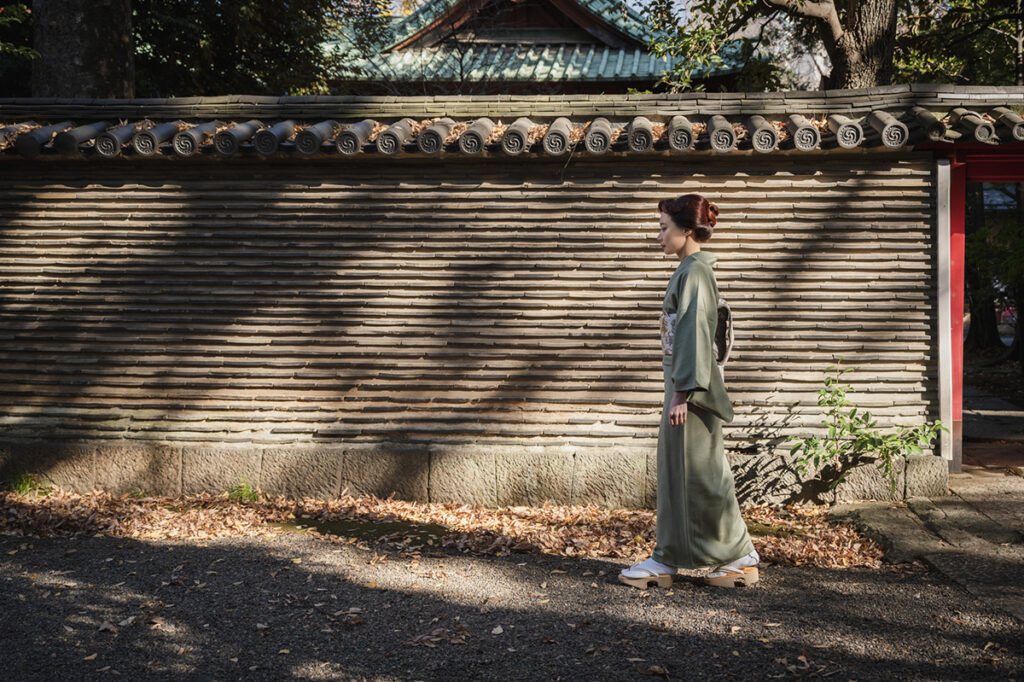 社殿を囲む瓦土塀を歩く姿は、映画のワンシーンのよう。この日の装いは、ペイズリー柄の江戸小紋に躍動する駿馬を織り出した袋帯