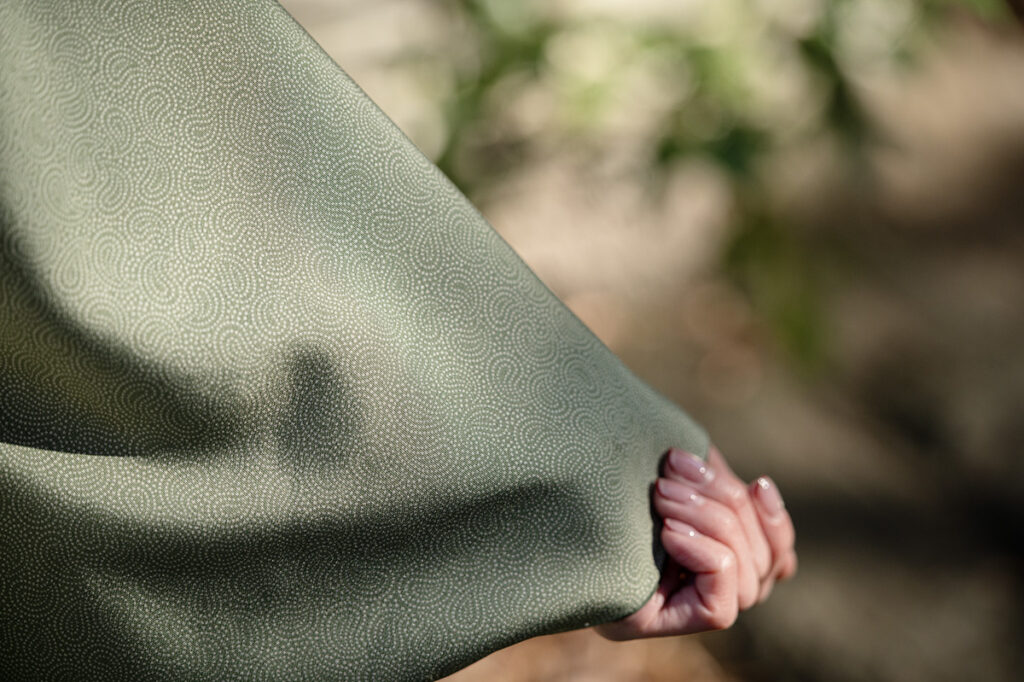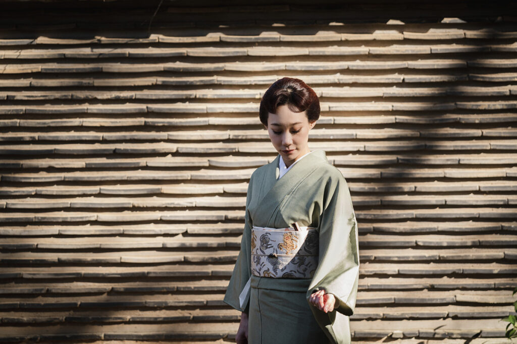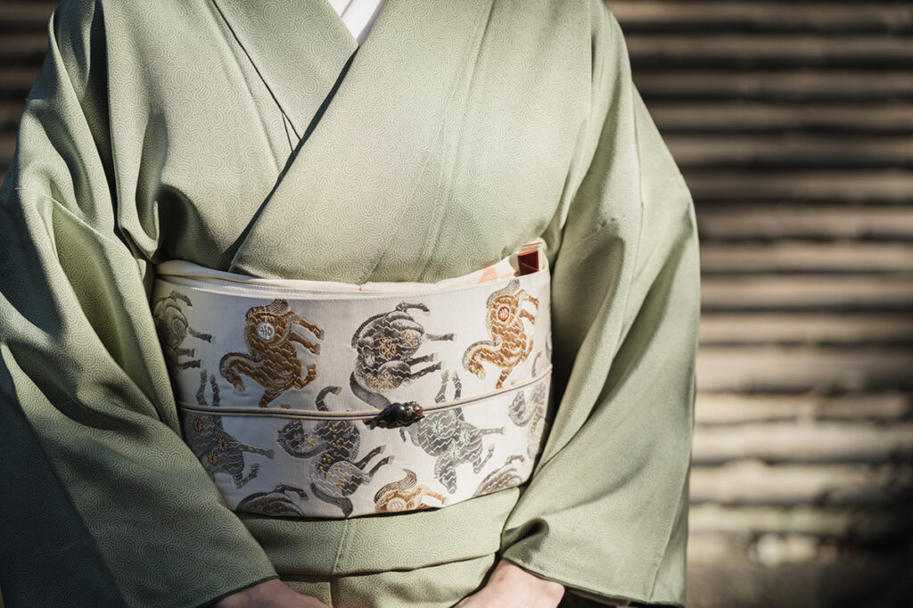 新春にふさわしい装いとしてユリアさんが選んだ着物は江戸小紋。質素倹約を奨励した徳川吉宗の時代に武士階級の間に広まった小紋で、遠目には無地に見えるほど微細な型染めが施された、江戸っ子のお洒落心が宿る一枚だ。ユリアさんの江戸小紋は、清雅な若松色にペイズリー柄をほどこしたオリエンタルな意匠。合わせた帯は、2026年の干支である“午年”にちなみ、躍動的な馬を織り出した袋帯だ。